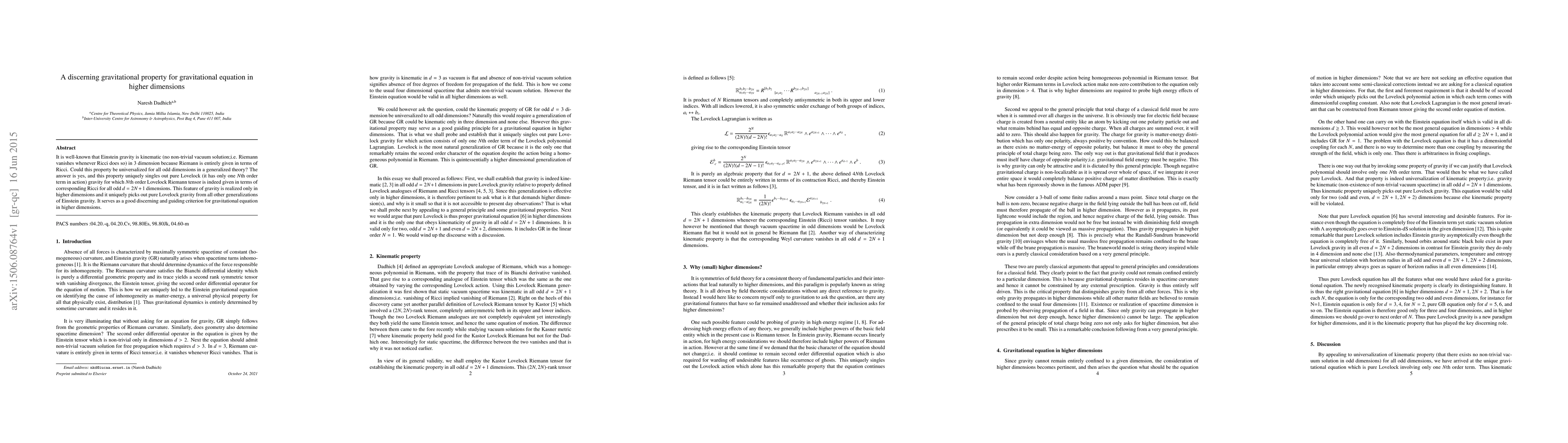 It is well-known that Einstein gravity is kinematic (no non-trivial vacuum solution;i.e. Riemann vanishes whenever Ricci does so) in $3$ dimension because Riemann is entirely given in terms of Ricci. Could this property be universalized for all odd dimensions in a generalized theory? The answer is yes, and this property uniquely singles out pure Lovelock (it has only one $N$th order term in action) gravity for which $N$th order Lovelock Riemann tensor is indeed given in terms of corresponding Ricci for all odd $d=2N+1$ dimensions. This feature of gravity is realized only in higher dimensions and it uniquely picks out pure Lovelock gravity from all other generalizations of Einstein gravity. It serves as a good discerning and guiding criterion for gravitational equation in higher dimensions.