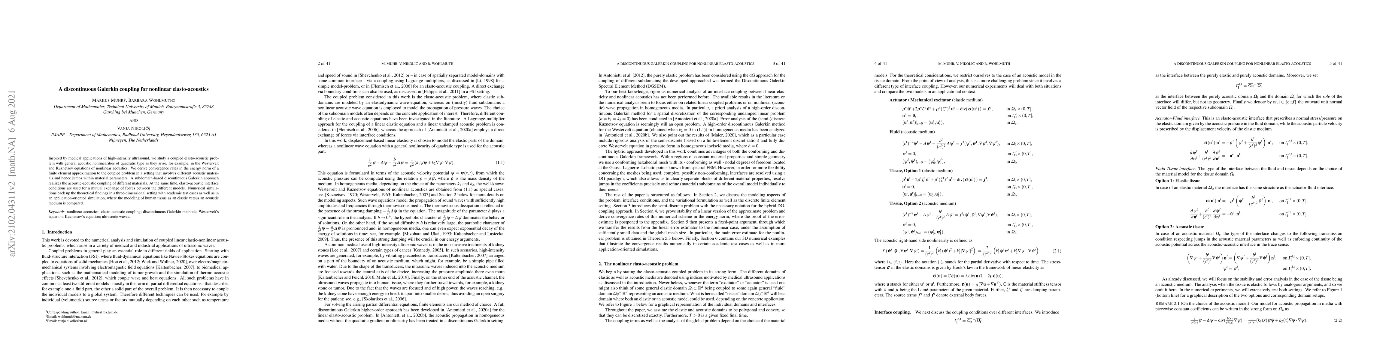 Inspired by medical applications of high-intensity ultrasound, we study a coupled elasto-acoustic problem with general acoustic nonlinearities of quadratic type as they arise, for example, in the Westervelt and Kuznetsov equations of nonlinear acoustics. We derive convergence rates in the energy norm of a finite element approximation to the coupled problem in a setting that involves different acoustic materials and hence jumps within material parameters. A subdomain-based discontinuous Galerkin approach realizes the acoustic-acoustic coupling of different materials. At the same time, elasto-acoustic interface conditions are used for a mutual exchange of forces between the different models. Numerical simulations back up the theoretical findings in a three-dimensional setting with academic test cases as well as in an application-oriented simulation, where the modeling of human tissue as an elastic versus an acoustic medium is compared.