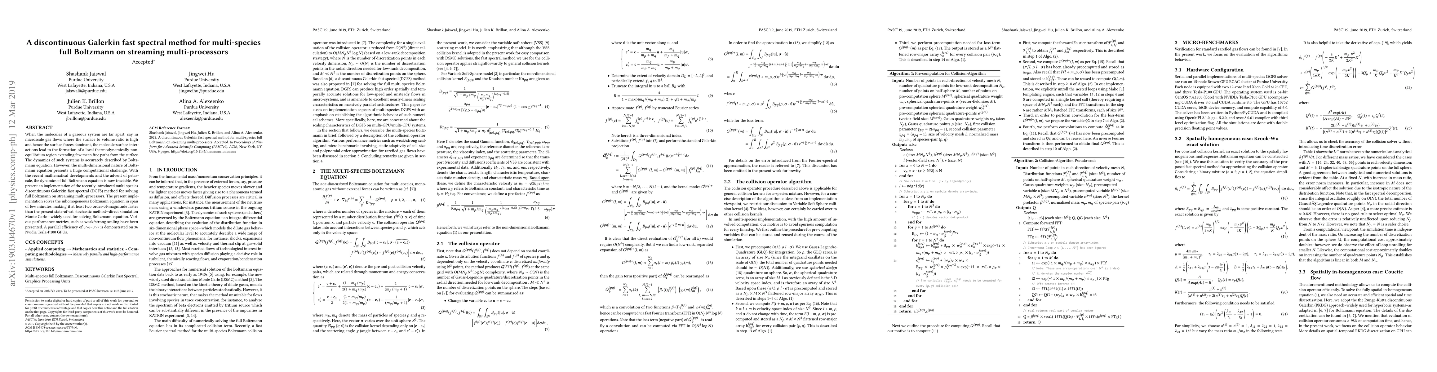 This paper introduces a discontinuous Galerkin fast spectral method (DGFS) for solving the multi-species full Boltzmann equation on streaming multi-processors, achieving significant speedups over the stochastic direct simulation Monte Carlo method. The implementation demonstrates high parallel efficiency on multiple GPUs.