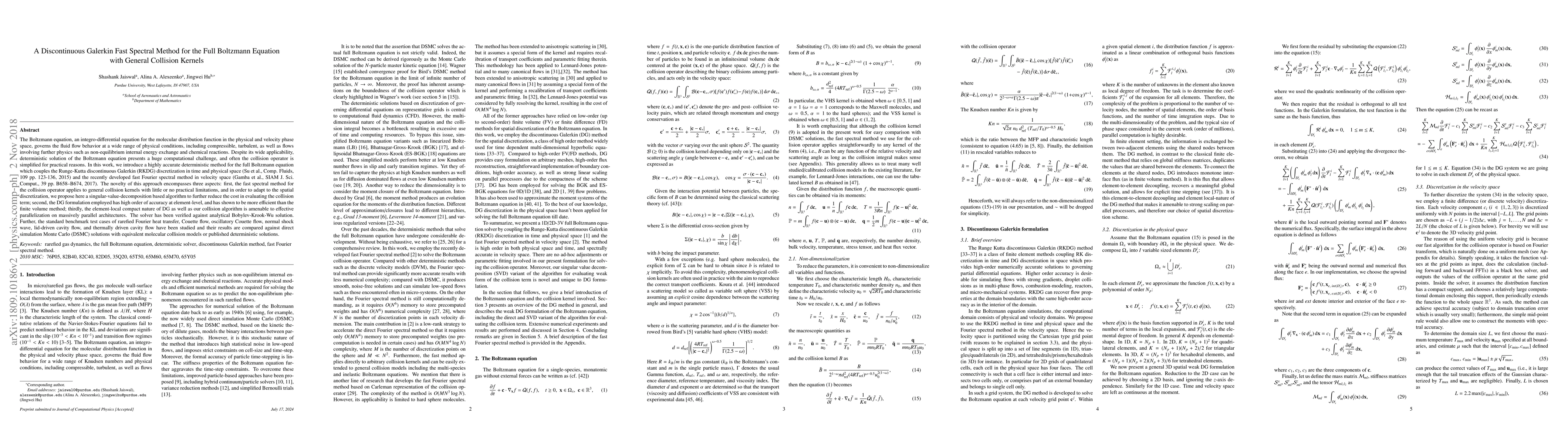 This paper introduces a highly accurate deterministic method for solving the full Boltzmann equation using a Runge-Kutta discontinuous Galerkin method coupled with a fast Fourier spectral method. The approach is novel in its application to general collision kernels, high-order accuracy, and effective parallelization.
