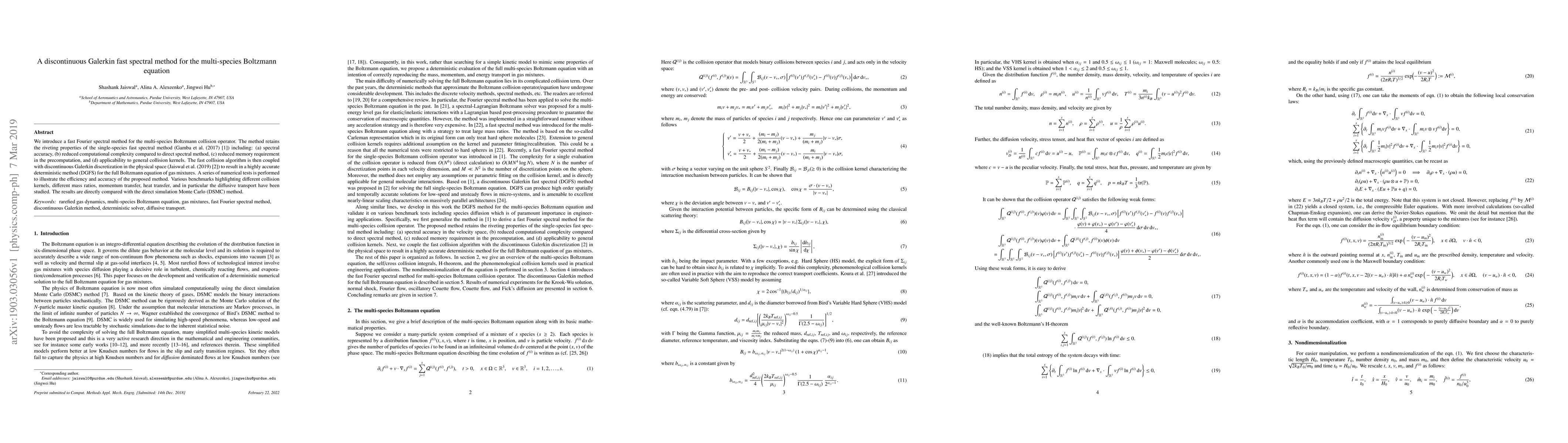 This paper proposes a fast Fourier spectral method for the multi-species Boltzmann collision operator, maintaining spectral accuracy and reduced computational complexity. The method is coupled with discontinuous Galerkin discretization for a highly accurate deterministic approach (DGFS) for gas mixtures, validated through numerical tests against the DSMC method.