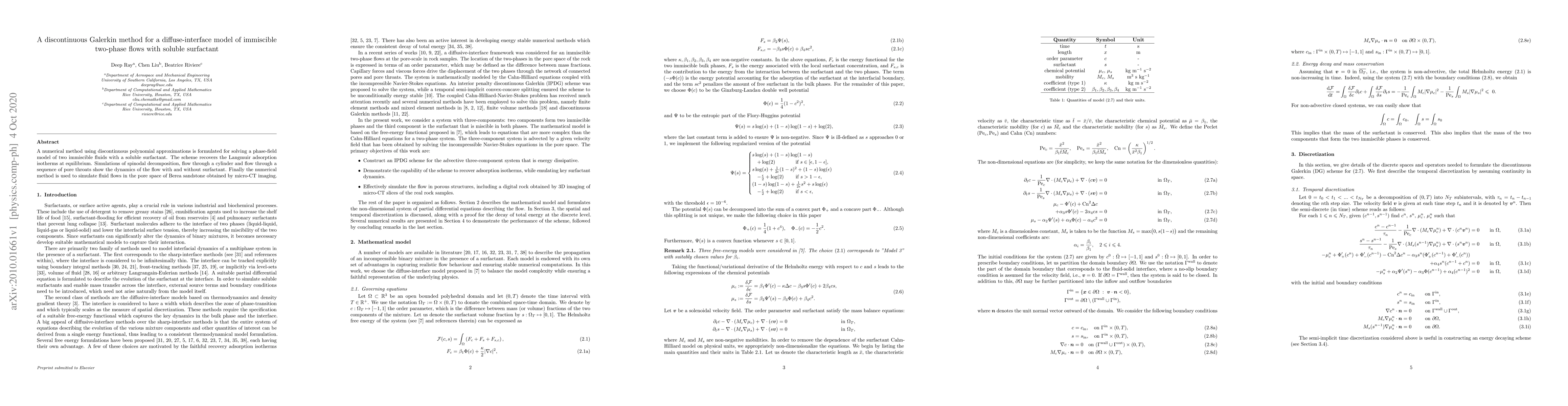 A numerical method using discontinuous polynomial approximations is formulated for solving a phase-field model of two immiscible fluids with a soluble surfactant. The scheme recovers the Langmuir adsorption isotherms at equilibrium. Simulations of spinodal decomposition, flow through a cylinder and flow through a sequence of pore throats show the dynamics of the flow with and without surfactant. Finally the numerical method is used to simulate fluid flows in the pore space of Berea sandstone obtained by micro-CT imaging.