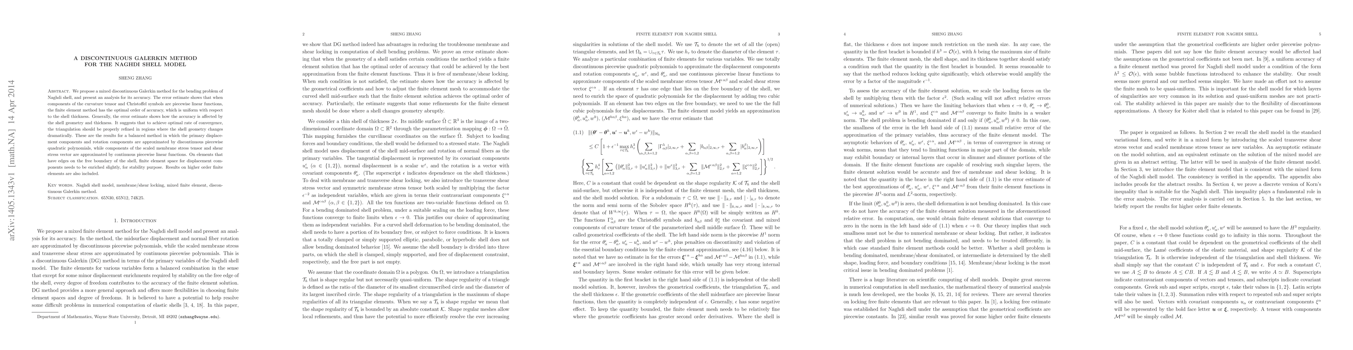 This paper proposes a mixed discontinuous Galerkin method for the Naghdi shell model, demonstrating optimal accuracy when curvature and Christoffel symbols are piecewise linear. The analysis suggests proper triangulation refinement in regions of significant geometric change for optimal convergence.