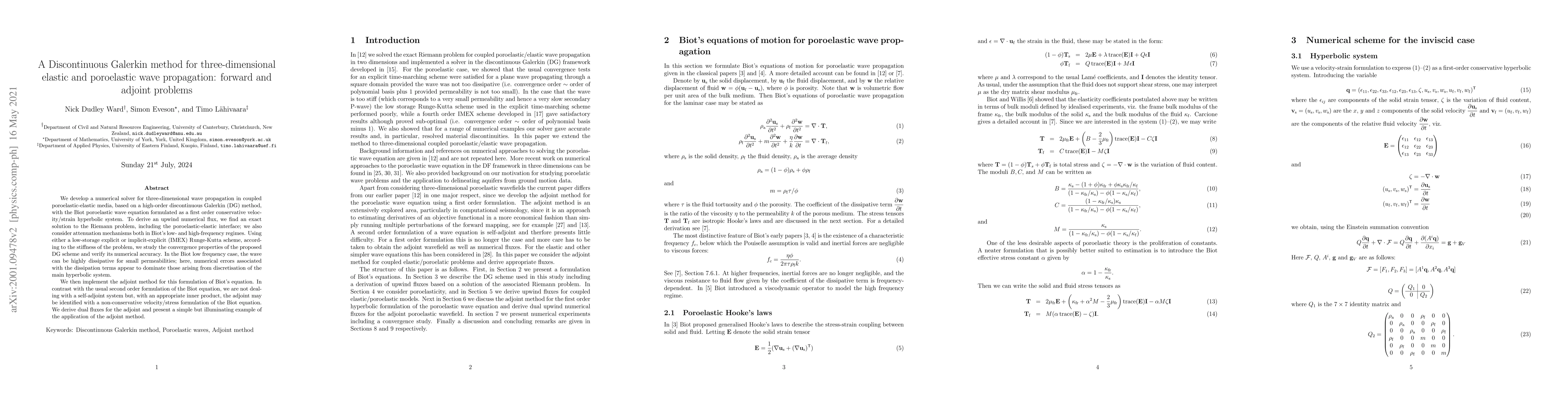 This paper develops a high-order discontinuous Galerkin method for solving three-dimensional wave propagation in coupled poroelastic and elastic media, focusing on Biot's equations. The authors derive an upwind numerical flux and study the method's convergence and accuracy, addressing both low- and high-frequency attenuation. They also implement an adjoint method for the non-conservative formulation of Biot's equation, presenting dual fluxes and an example application.