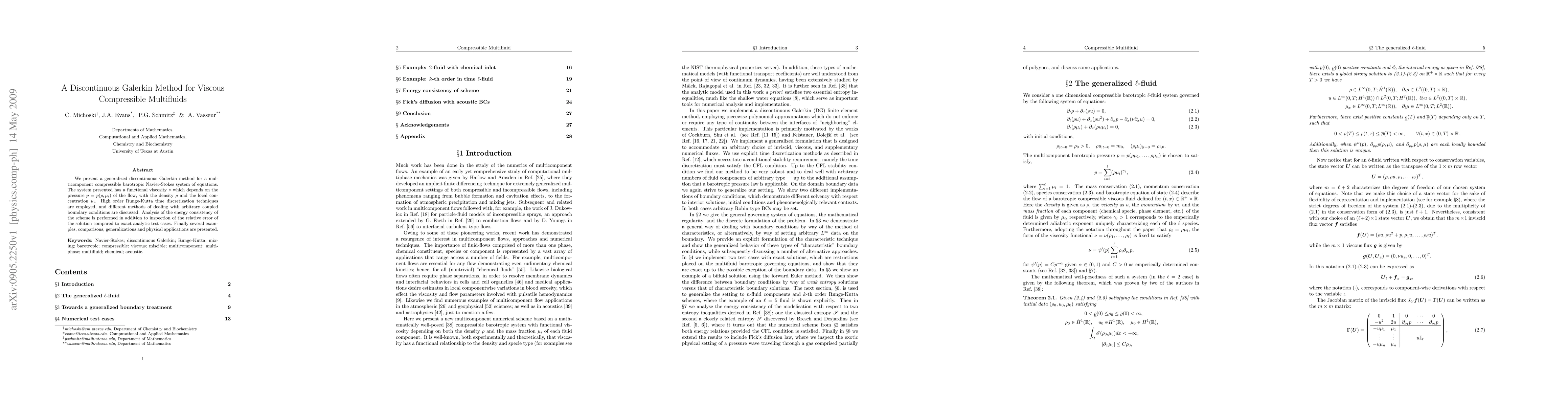 We present a generalized discontinuous Galerkin method for a multicomponent compressible barotropic Navier-Stokes system of equations. The system presented has a functional viscosity nu which depends on the pressure p=p(rho,mu_i) of the flow, with the density rho and the local concentration mu_i. High order Runge-Kutta time discretization techniques are employed, and different methods of dealing with arbitrary coupled boundary conditions are discussed. Analysis of the energy consistency of the scheme is performed in addition to inspection of the relative error of the solution compared to exact analytic test cases. Finally several examples, comparisons, generalizations and physical applications are presented.
