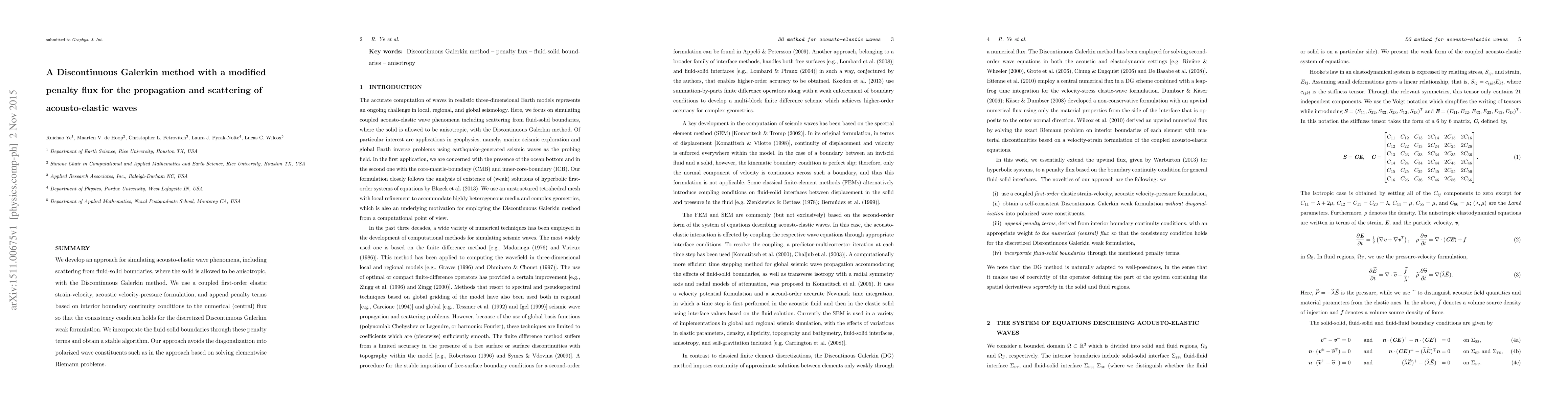 This paper proposes a Discontinuous Galerkin method with a modified penalty flux to simulate acousto-elastic wave propagation and scattering, including anisotropic solid materials. The method uses a coupled elastic strain-velocity formulation and achieves stability through interior boundary continuity conditions, avoiding the need for polarized wave decomposition.