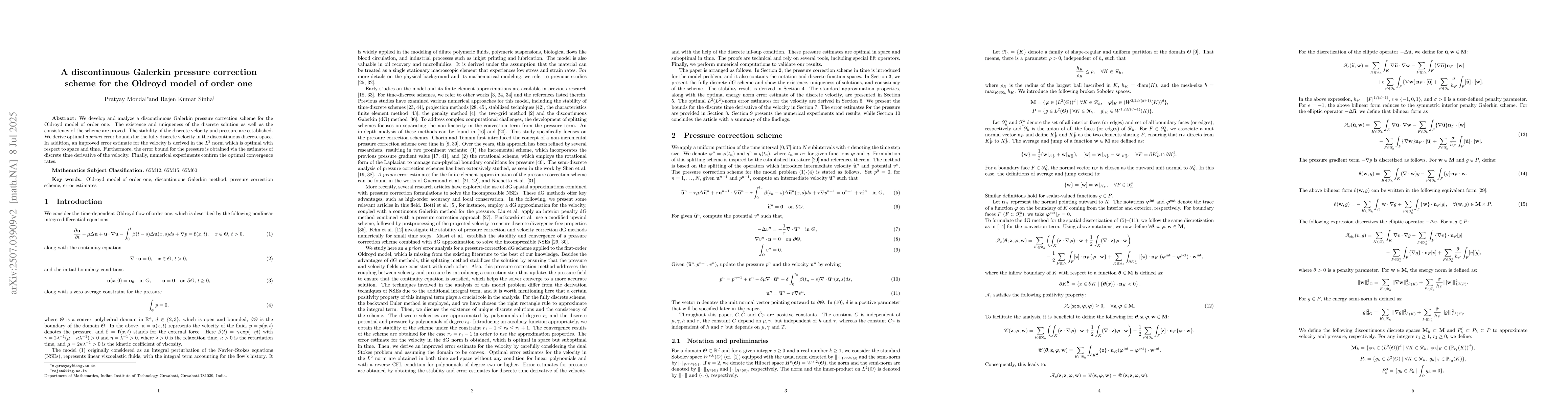 We develop and analyze a discontinuous Galerkin pressure correction scheme for the Oldroyd model of order one. The existence and uniqueness of the discrete solution as well as the consistency of the scheme are proved. The stability of the discrete velocity and pressure are established. We derive optimal $\textit{a priori}$ error bounds for the fully discrete velocity in the discontinuous discrete space. In addition, an improved error estimate for the velocity is derived in the $L^2$ norm which is optimal with respect to space and time. Furthermore, the error bound for the pressure is obtained via the estimates of discrete time derivative of the velocity. Finally, numerical experiments confirm the optimal convergence rates.