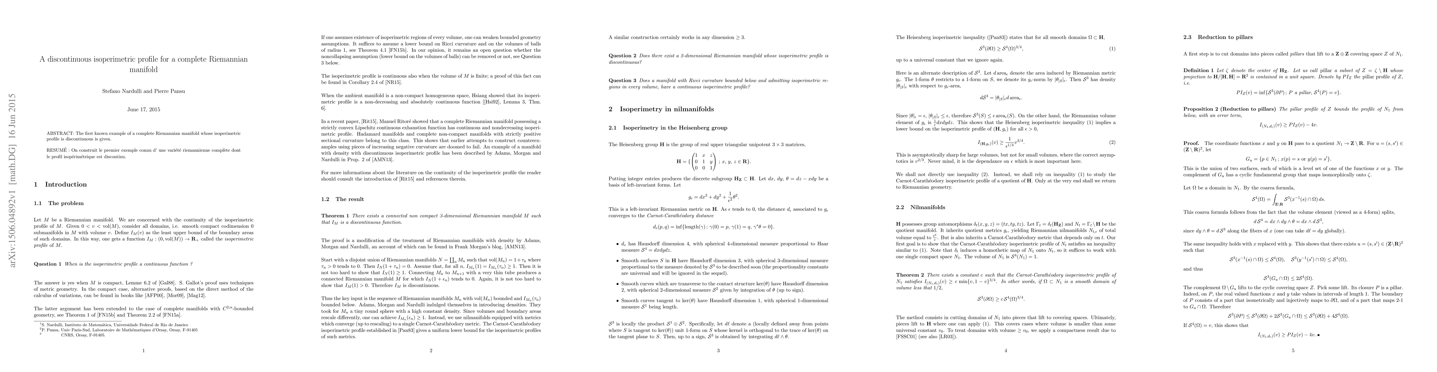 Summary: This paper presents the first example of a complete Riemannian manifold with a discontinuous isoperimetric profile, challenging previous assumptions about the continuity of such profiles. The findings provide new insights into the geometric properties of Riemannian manifolds.