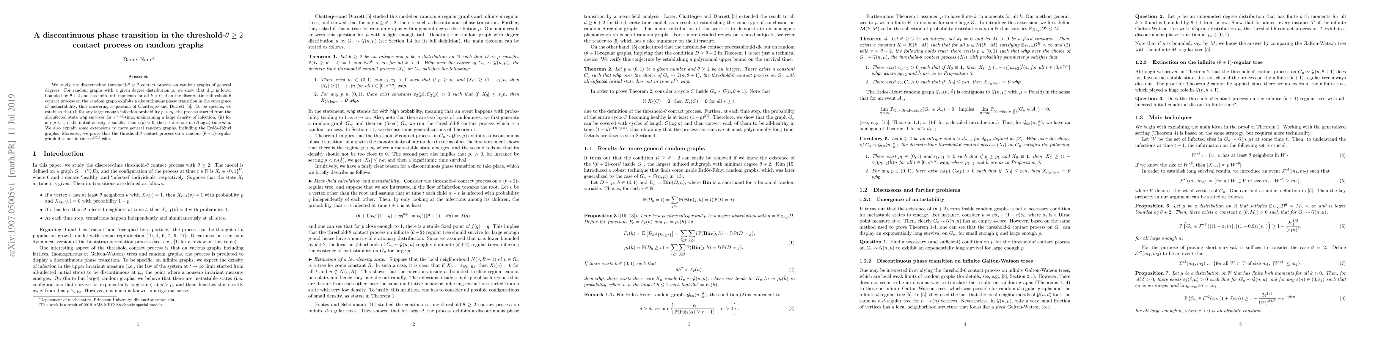 We study the discrete-time threshold-$\theta \geq 2$ contact process on random graphs of general degrees. For random graphs with a given degree distribution $\mu$, we show that if $\mu$ is lower bounded by $\theta+2$ and has finite $k$th moments for all $k>0$, then the discrete-time threshold-$\theta$ contact process on the random graph exhibits a discontinuous phase transition in the emergence of metastability, thus answering a question of Chatterjee and Durrett \cite{cd13}. To be specific, we establish that (i) for any large enough infection probability $p>p_1$, the process started from the all-infected state w.h.p. survives for $e^{\Theta(n)}$-time, maintaining a large density of infection; (ii) for any $p<1$, if the initial density is smaller than $\varepsilon(p)>0$, then it dies out in $O(\log n)$-time w.h.p.. We also explain some extensions to more general random graphs, including the Erd\H{o}s-R\'enyi graphs. Moreover, we prove that the threshold-$\theta$ contact process on a random $(\theta+1)$-regular graph dies out in time $n^{O(1)}$ w.h.p..
