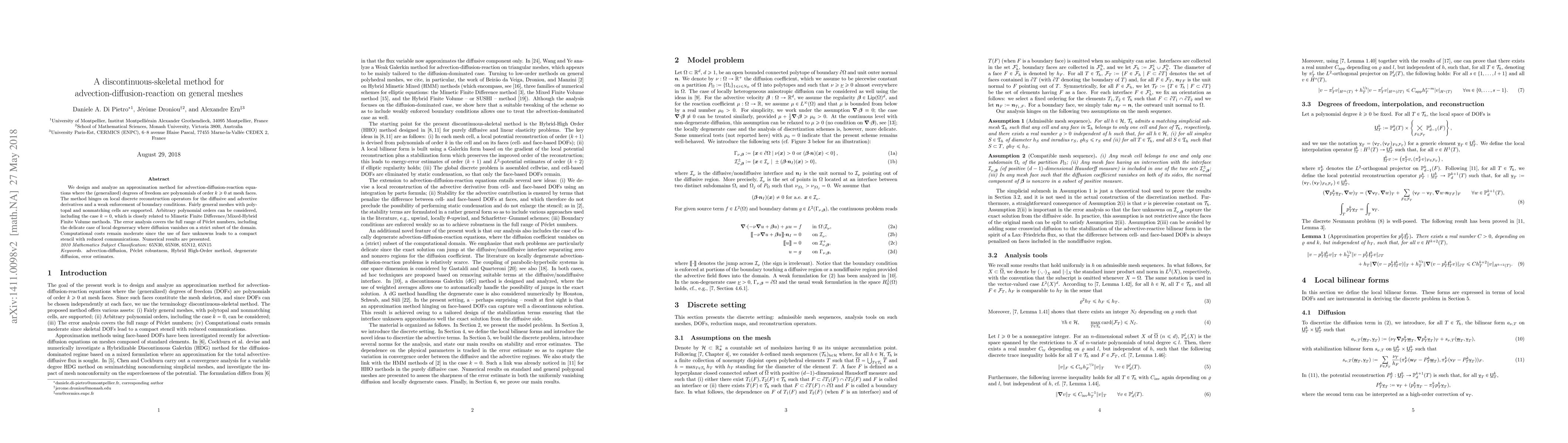 This paper proposes a discontinuous-skeletal method for solving advection-diffusion-reaction equations on general meshes, utilizing polynomial reconstruction at mesh faces and weak boundary enforcement. The method supports arbitrary polynomial orders and general polytopal meshes, with moderate computational costs due to compact stencils.