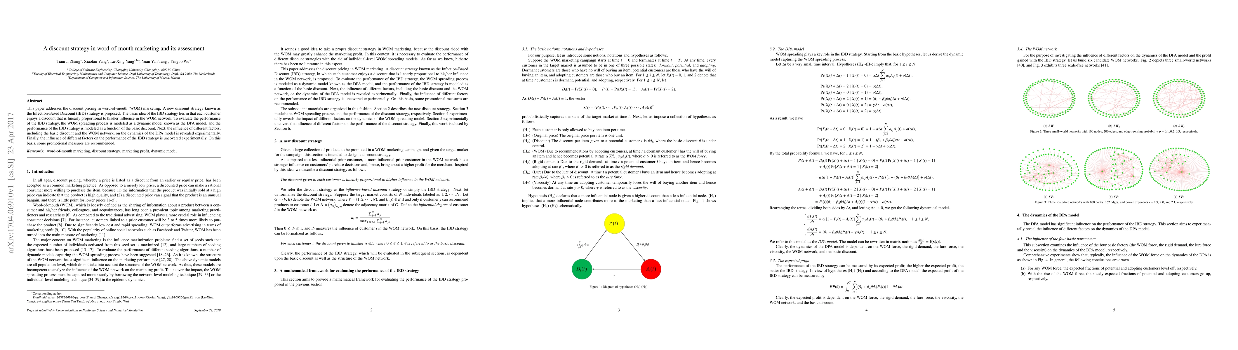 This paper addresses the discount pricing in word-of-mouth (WOM) marketing. A new discount strategy known as the Infection-Based Discount (IBD) strategy is proposed. The basic idea of the IBD strategy lies in that each customer enjoys a discount that is linearly proportional to his/her influence in the WOM network. To evaluate the performance of the IBD strategy, the WOM spreading process is modeled as a dynamic model known as the DPA model, and the performance of the IBD strategy is modeled as a function of the basic discount. Next, the influence of different factors, including the basic discount and the WOM network, on the dynamics of the DPA model is revealed experimentally. Finally, the influence of different factors on the performance of the IBD strategy is uncovered experimentally. On this basis, some promotional measures are recommended.