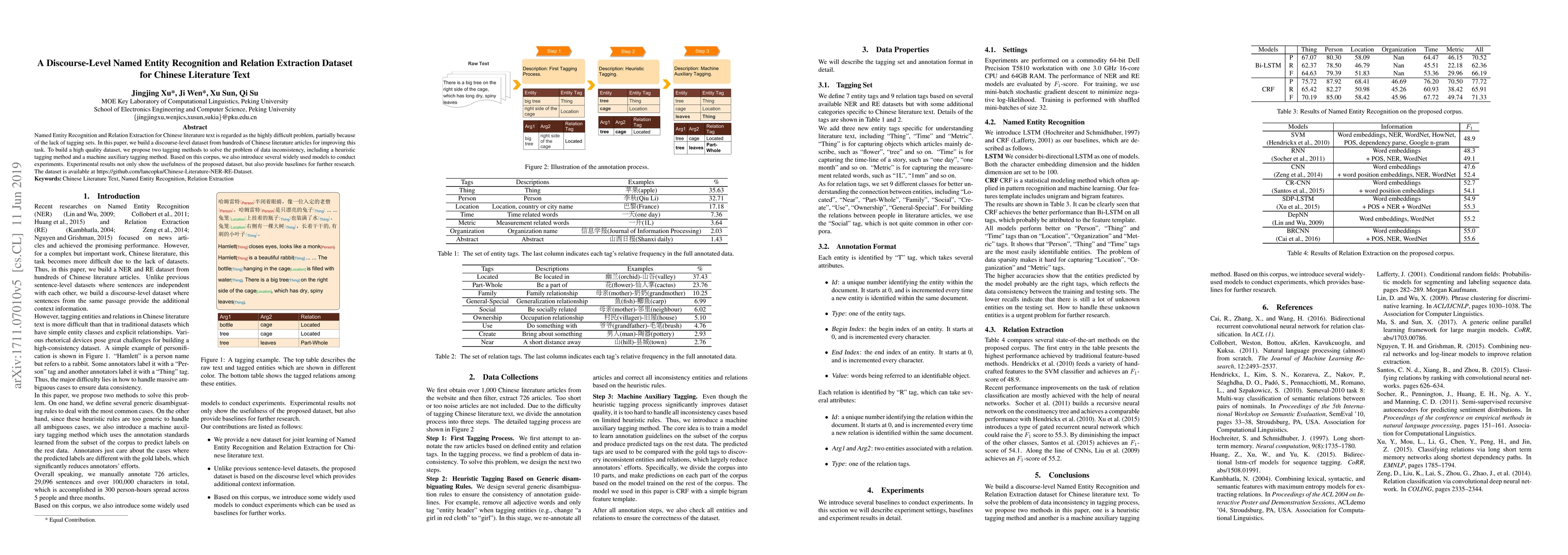 This paper presents a discourse-level dataset for Named Entity Recognition and Relation Extraction in Chinese literature, addressing the challenge of data inconsistency with two tagging methods. Experimental results demonstrate the dataset's utility and provide baselines for future research, with the dataset available on GitHub.