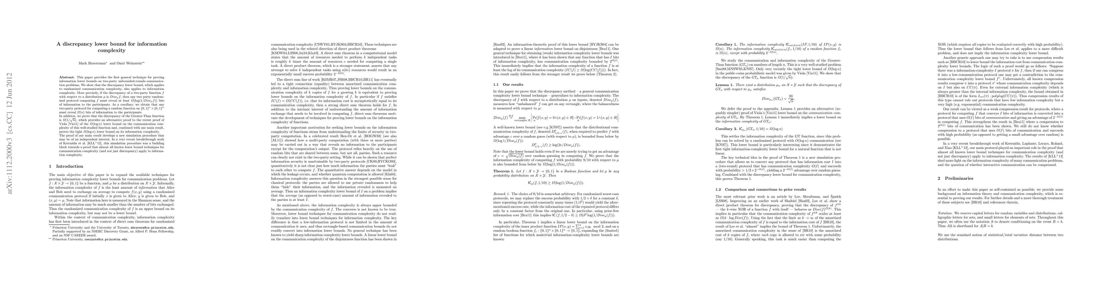 This paper establishes a new technique for proving information lower bounds on two-party communication problems, showing that the discrepancy lower bound applies to information complexity. It reveals that any two-party protocol must disclose at least $\Omega(\log (1/Disc_\mu f))$ bits of information, leading to a $\Omega(n)$ bit information lower bound for random functions.