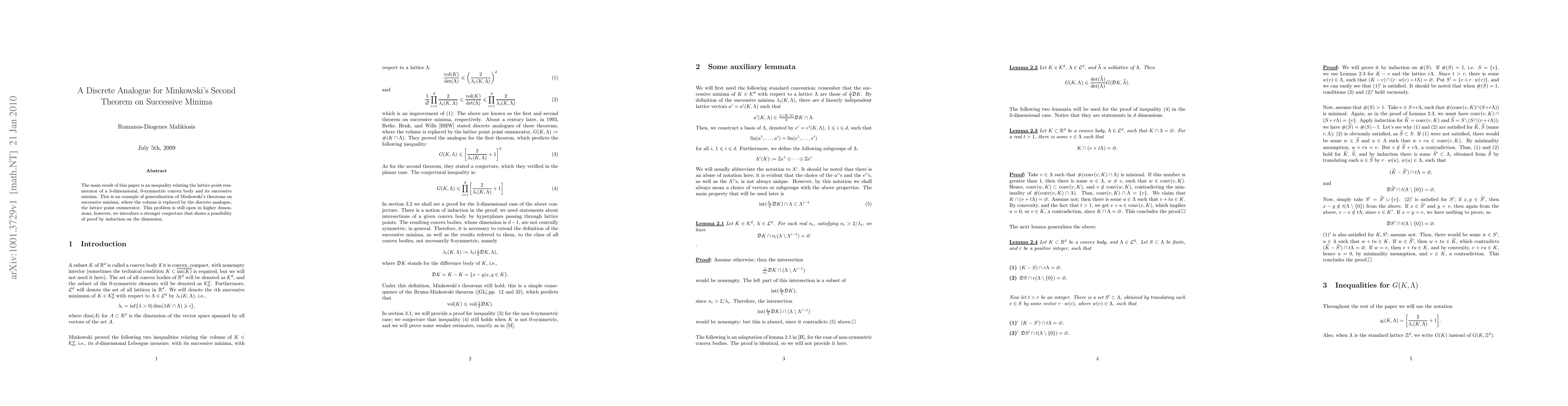 This paper presents an inequality linking the lattice point count of a 3-dimensional, 0-symmetric convex body with its successive minima, extending Minkowski's second theorem to a discrete analogue. The authors propose a stronger conjecture suggesting a proof strategy using induction on dimension for higher-dimensional cases.