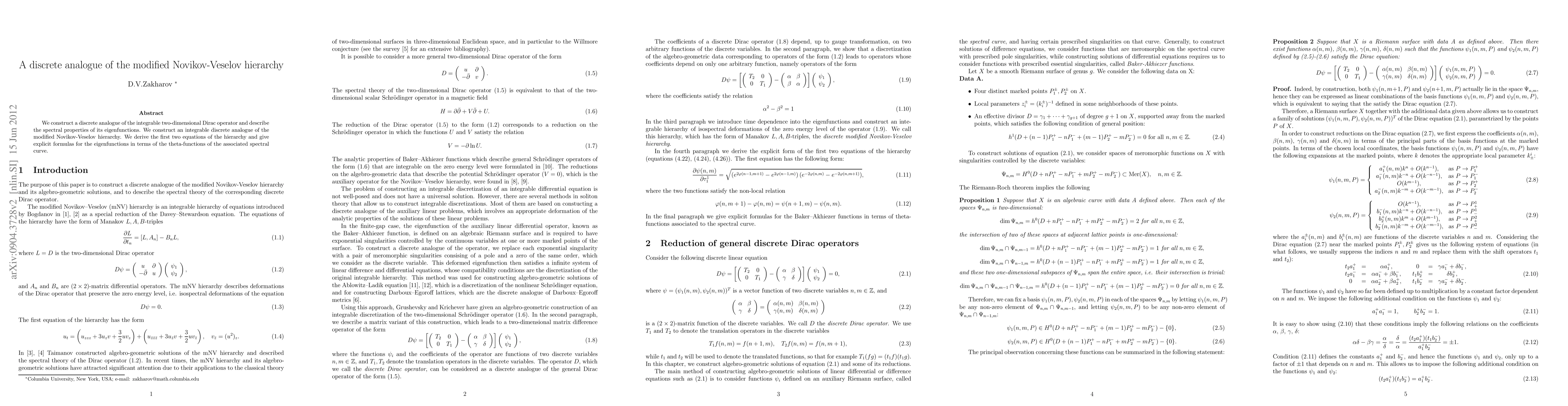 This paper constructs a discrete analogue of the integrable two-dimensional Dirac operator and explores its spectral properties. It also develops an integrable discrete version of the modified Novikov-Veselov hierarchy, providing explicit formulas for eigenfunctions in terms of theta-functions.