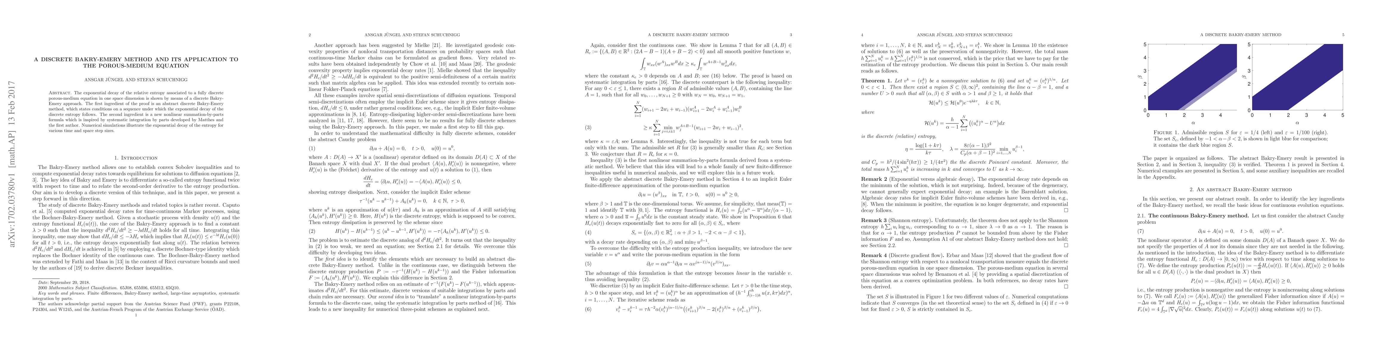 This paper presents a discrete Bakry-Emery method to prove the exponential decay of relative entropy for a fully discrete porous-medium equation. It introduces a new nonlinear summation-by-parts formula and uses numerical simulations to validate the theoretical results.