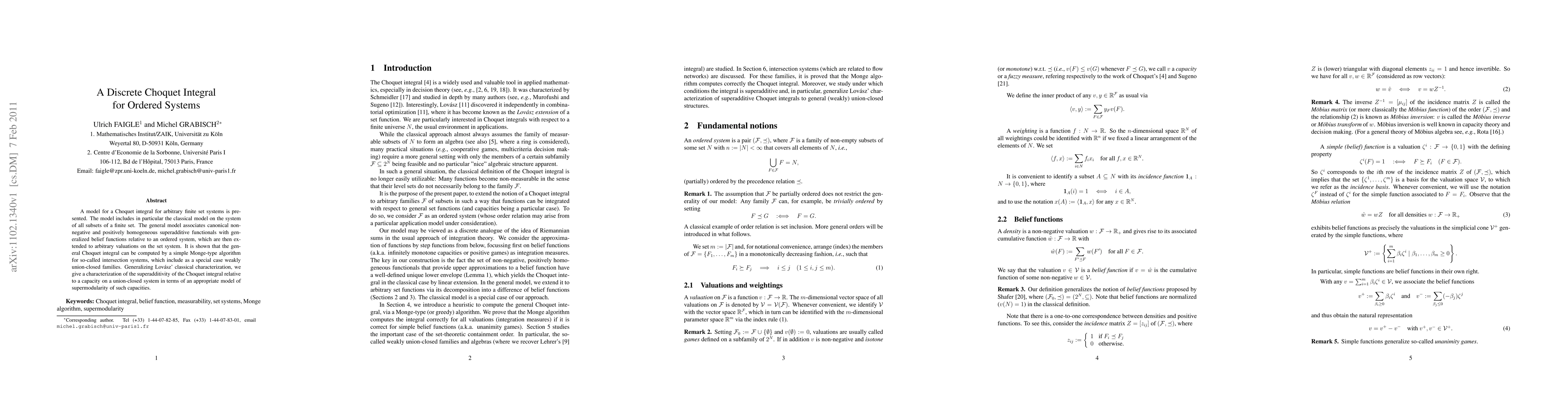 This paper introduces a discrete Choquet integral model for finite set systems, extending it to ordered systems and intersection systems. It characterizes superadditivity of the integral in terms of supermodularity for union-closed families, utilizing a Monge-type algorithm for computation.