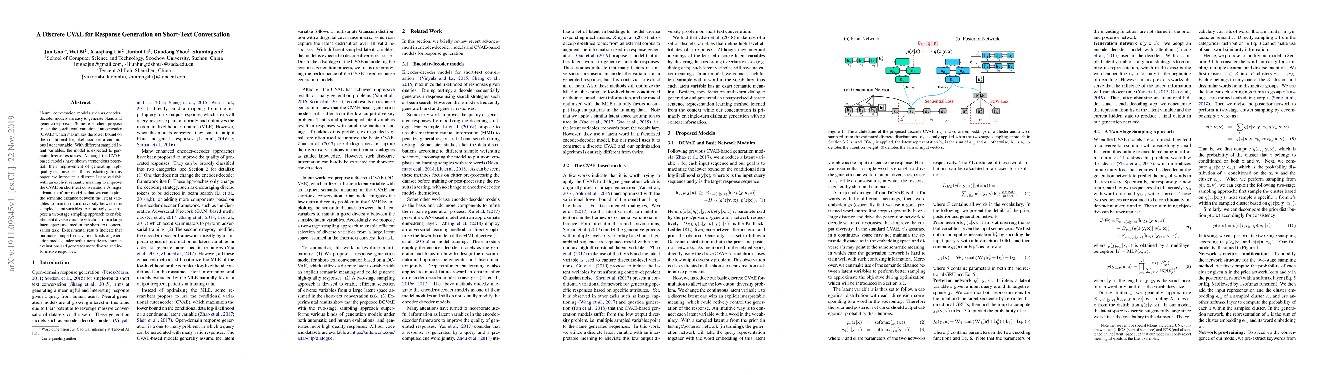 This paper introduces a discrete CVAE for generating diverse and high-quality responses in short-text conversations, utilizing a two-stage sampling approach to efficiently select diverse latent variables and improving response quality over traditional encoder-decoder models. Experimental results show significant improvements in both automatic and human evaluations.