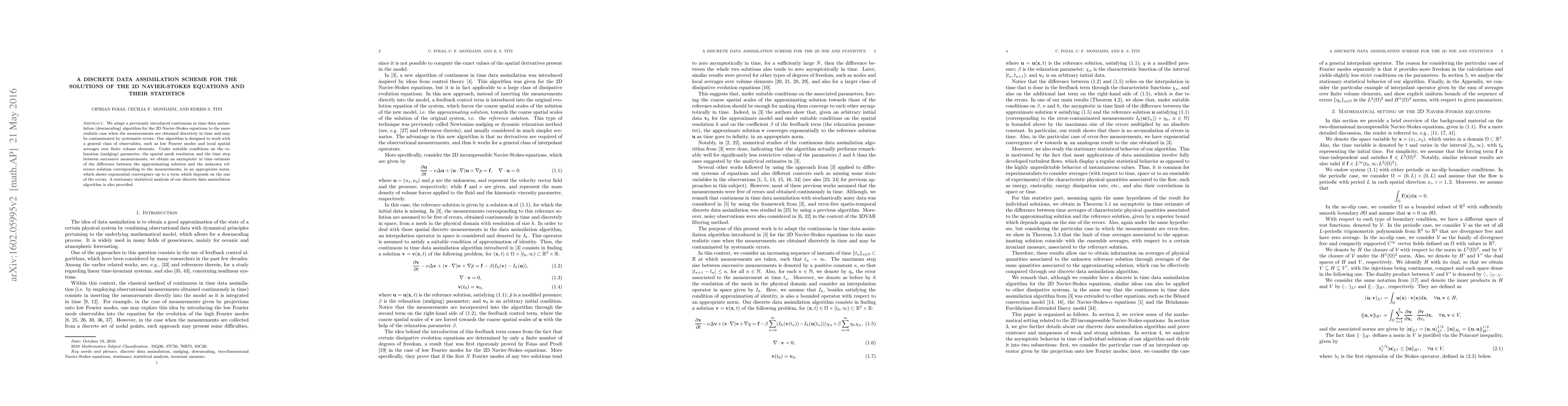 This paper adapts a continuous data assimilation algorithm for the 2D Navier-Stokes equations to handle discrete measurements, showing exponential convergence under suitable conditions. It also provides a stationary statistical analysis of the adapted algorithm.