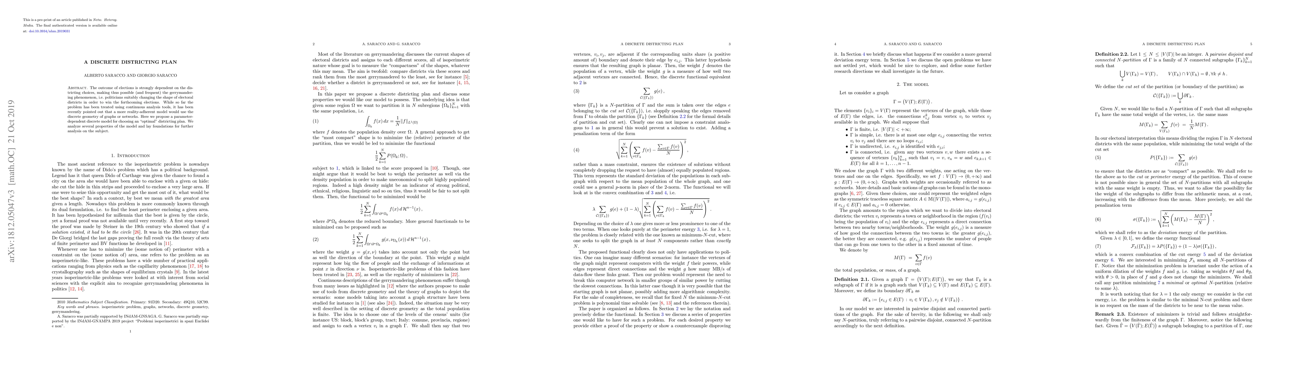 The outcome of elections is strongly dependent on the districting choices, making thus possible (and frequent) the gerrymandering phenomenon, i.e.\ politicians suitably changing the shape of electoral districts in order to win the forthcoming elections. While so far the problem has been treated using continuous analysis tools, it has been recently pointed out that a more reality-adherent model would use the discrete geometry of graphs or networks. Here we propose a parameter-dependent discrete model for choosing an "optimal" districting plan. We analyze several properties of the model and lay foundations for further analysis on the subject.