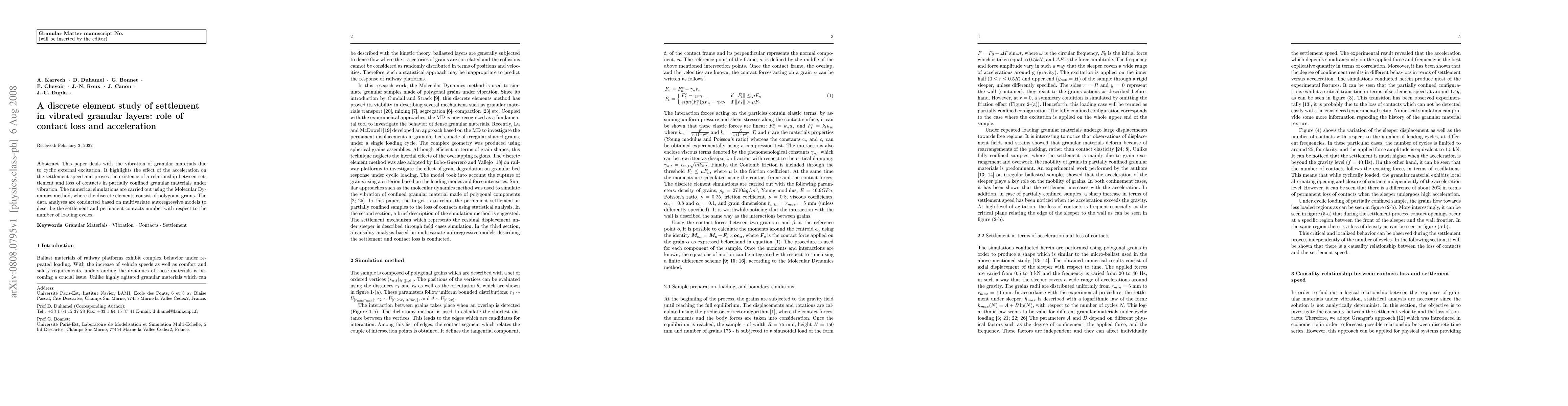 This paper deals with the vibration of granular materials due to cyclic external excitation. It highlights the effect of the acceleration on the settlement speed and proves the existence of a relationship between settlement and loss of contacts in partially confined granular materials under vibration. The numerical simulations are carried out using the Molecular Dynamics method, where the discrete elements consist of polygonal grains. The data analyses are conducted based on multivariate autoregressive models to describe the settlement and permanent contacts number with respect to the number of loading cycles.