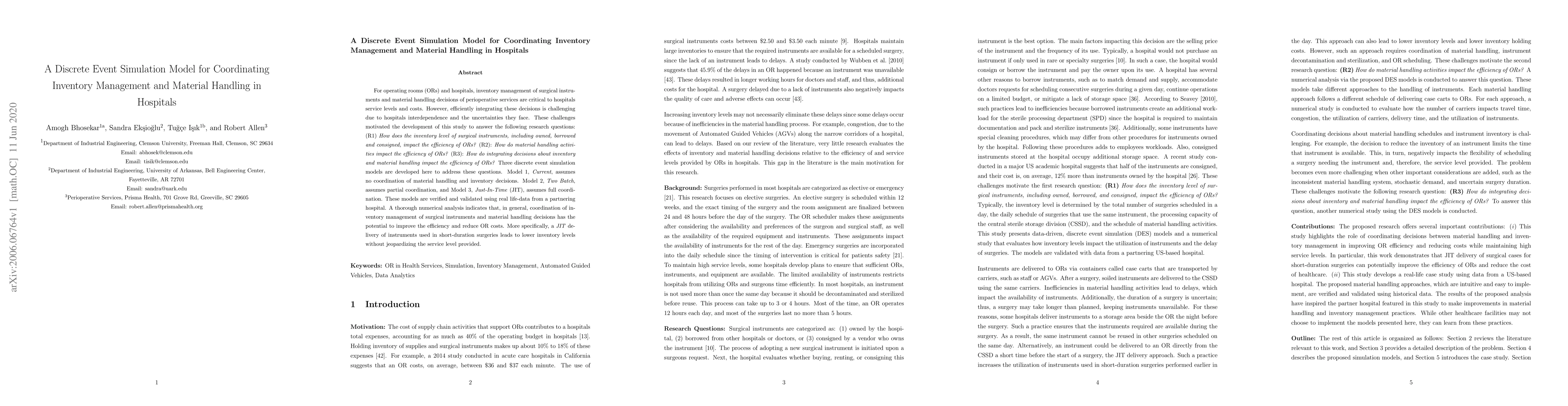 For operating rooms (ORs) and hospitals, inventory management of surgical instruments and material handling decisions of perioperative services are critical to hospitals' service levels and costs. However, efficiently integrating these decisions is challenging due to hospitals' interdependence and the uncertainties they face. These challenges motivated the development of this study to answer the following research questions: (R1) How does the inventory level of surgical instruments, including owned, borrowed and consigned, impact the efficiency of ORs? (R2) How do material handling activities impact the efficiency of ORs? (R3) How do integrating decisions about inventory and material handling impact the efficiency of ORs? Three discrete event simulation models are developed here to address these questions. Model 1, Current, assumes no coordination of material handling and inventory decisions. Model 2, Two Batch, assumes partial coordination, and Model 3, Just-In-Time (JIT), assumes full coordination. These models are verified and validated using real life-data from a partnering hospital. A thorough numerical analysis indicates that, in general, coordination of inventory management of surgical instruments and material handling decisions has the potential to improve the efficiency and reduce OR costs. More specifically, a JIT delivery of instruments used in short-duration surgeries leads to lower inventory levels without jeopardizing the service level provided.