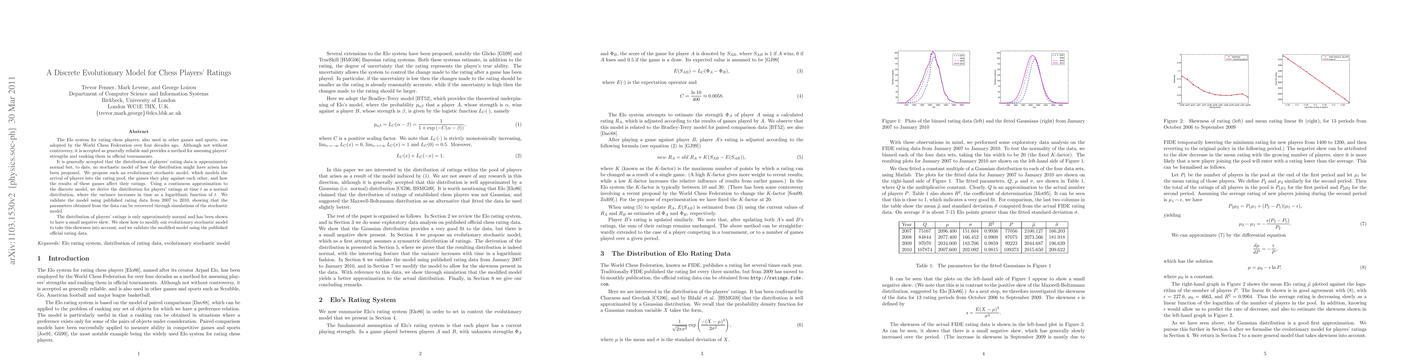 This paper proposes a stochastic evolutionary model to explain the distribution of chess players' ratings, showing how the ratings evolve over time through player arrivals, game outcomes, and rating adjustments. The model is validated against historical data and modified to account for the observed skewness in the ratings distribution.