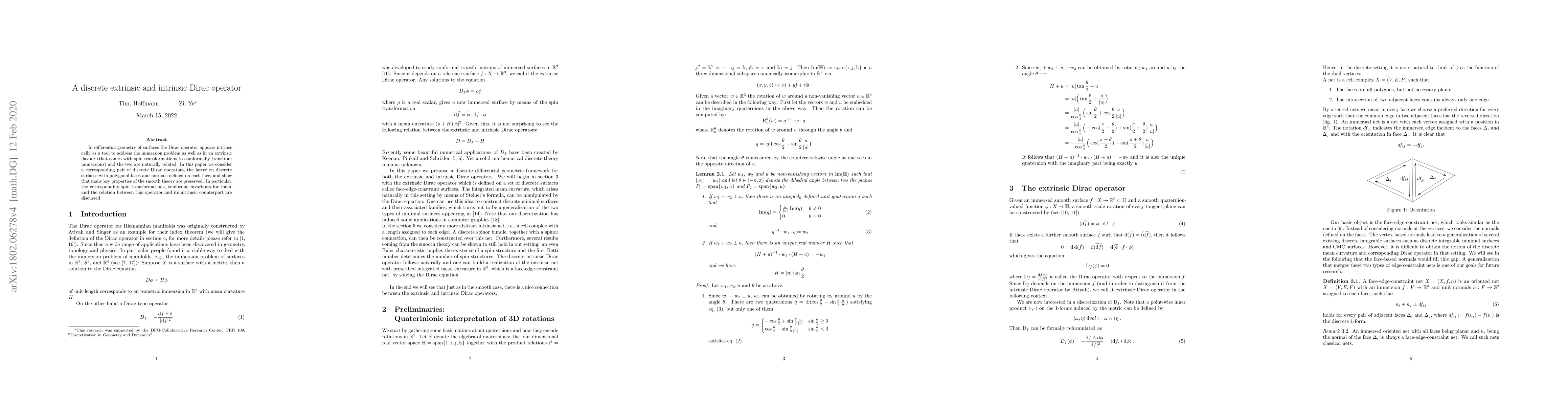 This paper introduces discrete versions of extrinsic and intrinsic Dirac operators, preserving key properties like spin transformations and conformal invariants. It discusses their relation on discrete surfaces with polygonal faces and normals.