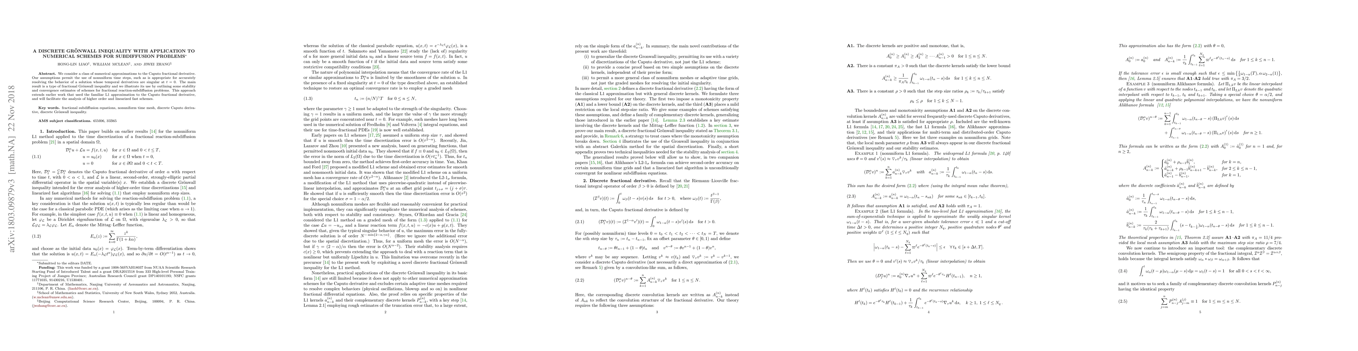 This paper introduces a discrete Grönwall inequality to analyze numerical schemes for subdiffusion problems, allowing for nonuniform time steps and facilitating the study of higher-order and linearized fast schemes.