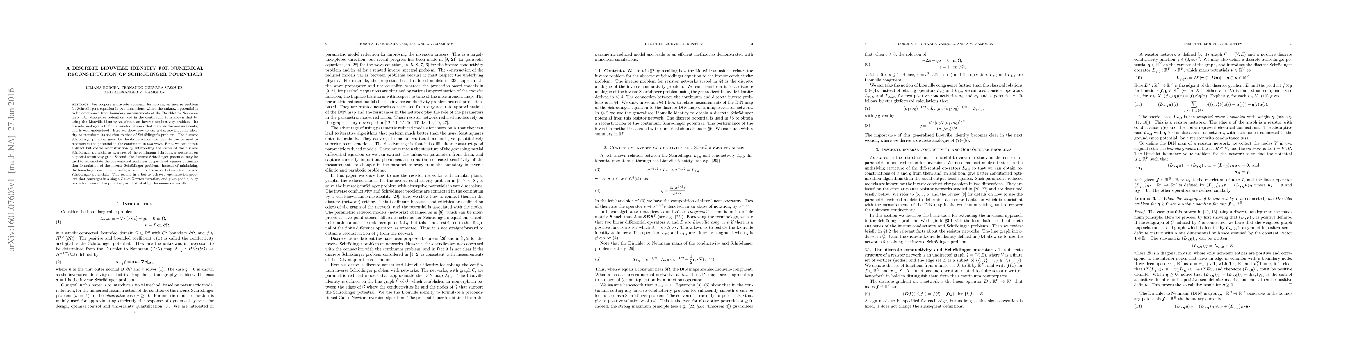 This paper proposes a discrete Liouville identity to solve an inverse problem for Schrödinger's equation in two dimensions, reconstructing the Schrödinger potential from boundary measurements. It reformulates the problem to achieve a better-behaved optimization that converges quickly, yielding high-quality potential reconstructions.