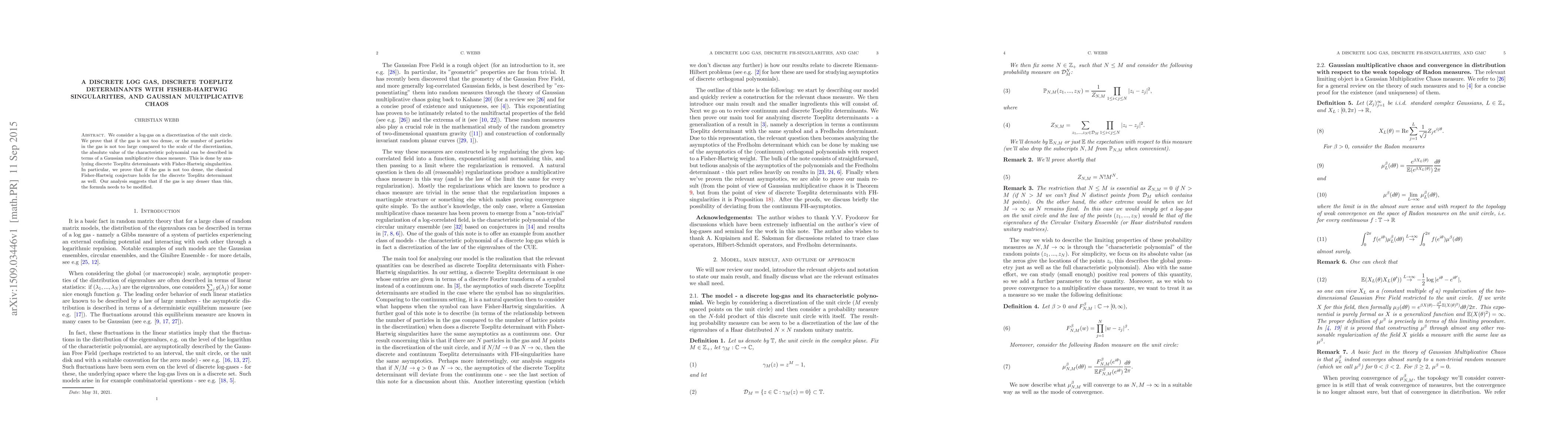 We consider a log-gas on a discretization of the unit circle. We prove that if the gas is not too dense, or the number of particles in the gas is not too large compared to the scale of the discretization, the absolute value of the characteristic polynomial can be described in terms of a Gaussian multiplicative chaos measure. This is done by analyzing discrete Toeplitz determinants with Fisher-Hartwig singularities. In particular, we prove that if the gas is not too dense, the classical Fisher-Hartwig conjecture holds for the discrete Toeplitz determinant as well. Our analysis suggests that if the gas is any denser than this, the formula needs to be modified.