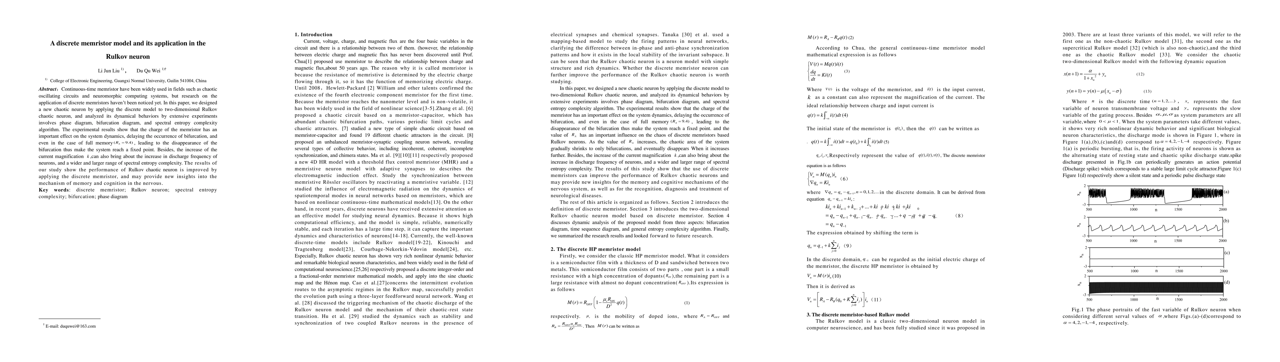 Continuous time memristor have been widely used in fields such as chaotic oscillating circuitsand neuromorphic computing systems, but research on the application of discretememristors haven't been noticed yet. In this paper, we designed a new chaoticneuron by applying the discrete model to two-dimensional Rulkov chaotic neuron,and analyzed its dynamical behaviors by extensive experiments involves phasediagram, bifurcation diagram, and spectral entropy complexity algorithm. The experimental results show that the charge of the memristor has an importanteffect on the system dynamics, delaying the occurrence of bifurcation, and evenin the case of full memory, leading to the disappearance of the bifurcation thus makethe system reach a fixed point. Besides, the increase of the current magnification,can also bring about the increase in discharge frequency ofneurons, and a wider and larger range of spectral entropy complexity. The results of our study show the performance of Rulkov chaotic neuronis improved by applying thediscrete memristor, and may provide new insights into the mechanism of memoryand cognition in the nervous.
