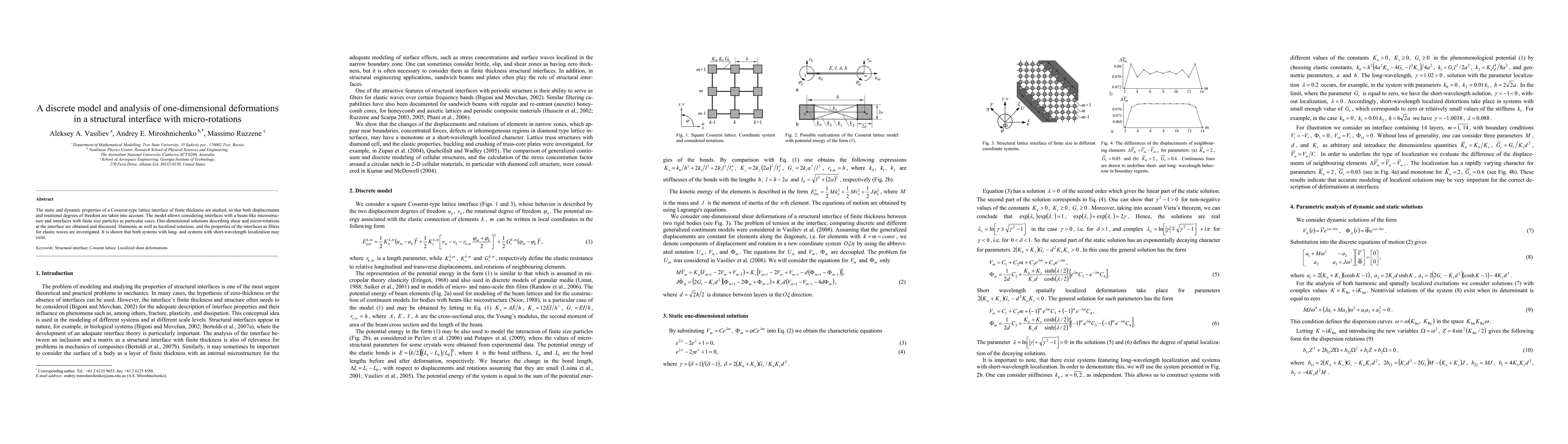 The static and dynamic properties of a Cosserat-type lattice interface of finite thickness are studied, so that both displacements and rotational degrees of freedom are taken into account. The model allows considering interfaces with a beam-like microstructure and interfaces with finite size particles as particular cases. One-dimensional solutions describing shear and micro-rotations at the interface are obtained and discussed. Harmonic as well as localized solutions, and the properties of the interfaces as filters for elastic waves are investigated. It is shown that both systems with long- and short-wavelength localization may exist.