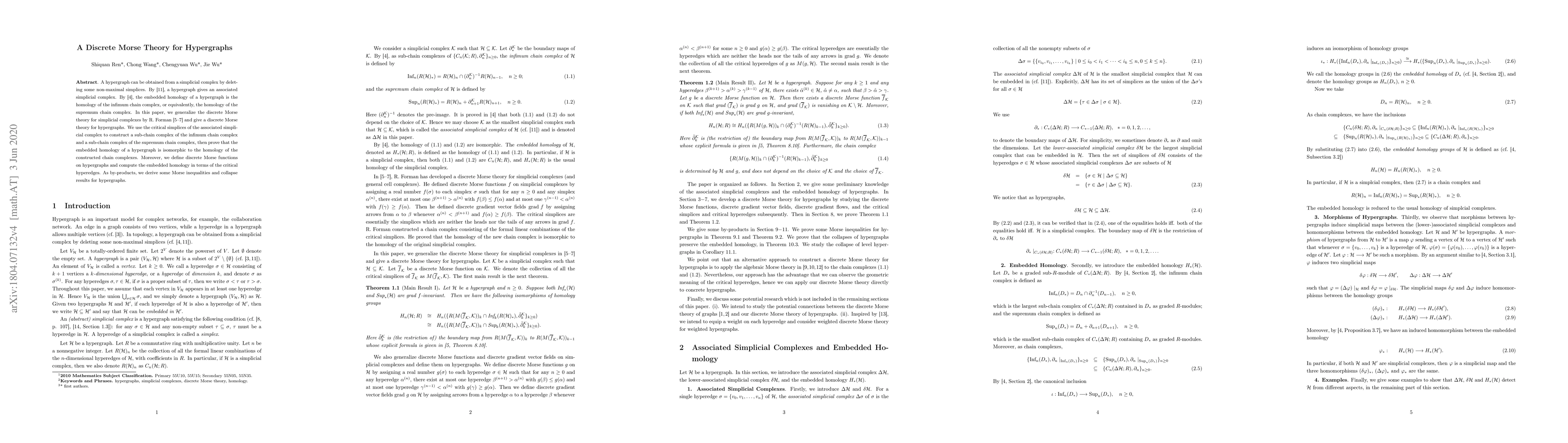 This paper extends discrete Morse theory to hypergraphs, generalizing Forman's approach for simplicial complexes. It constructs sub-chain complexes and proves homology equivalence, introducing discrete Morse functions and deriving Morse inequalities and collapse results for hypergraphs.