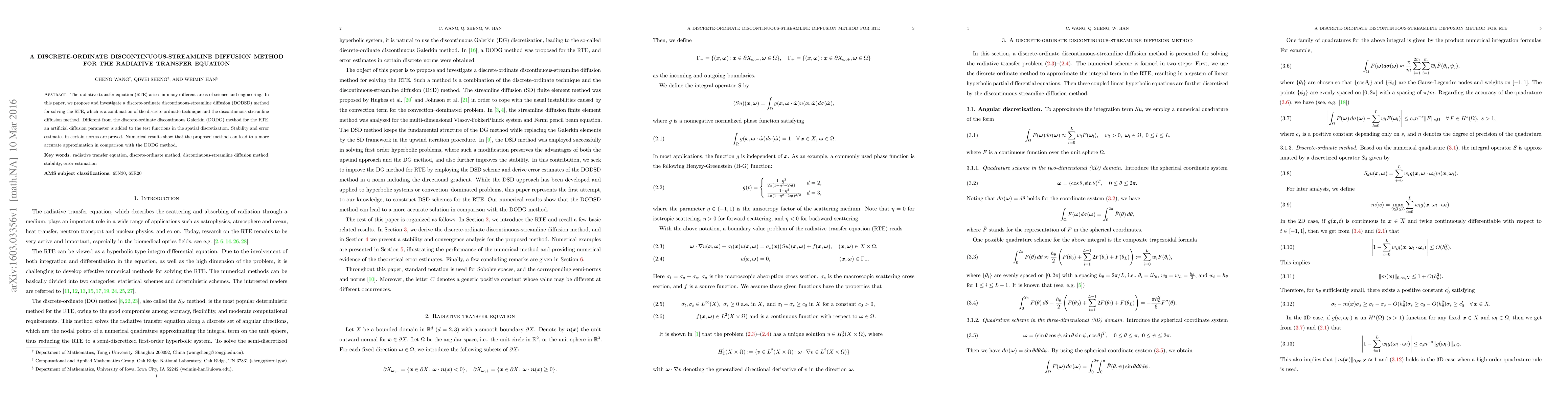 This paper proposes a discrete-ordinate discontinuous-streamline diffusion (DODSD) method for solving the radiative transfer equation (RTE), combining discrete-ordinate technique with an artificial diffusion parameter. The method demonstrates improved stability and accuracy compared to the discrete-ordinate discontinuous Galerkin (DODG) method, as shown through numerical results.