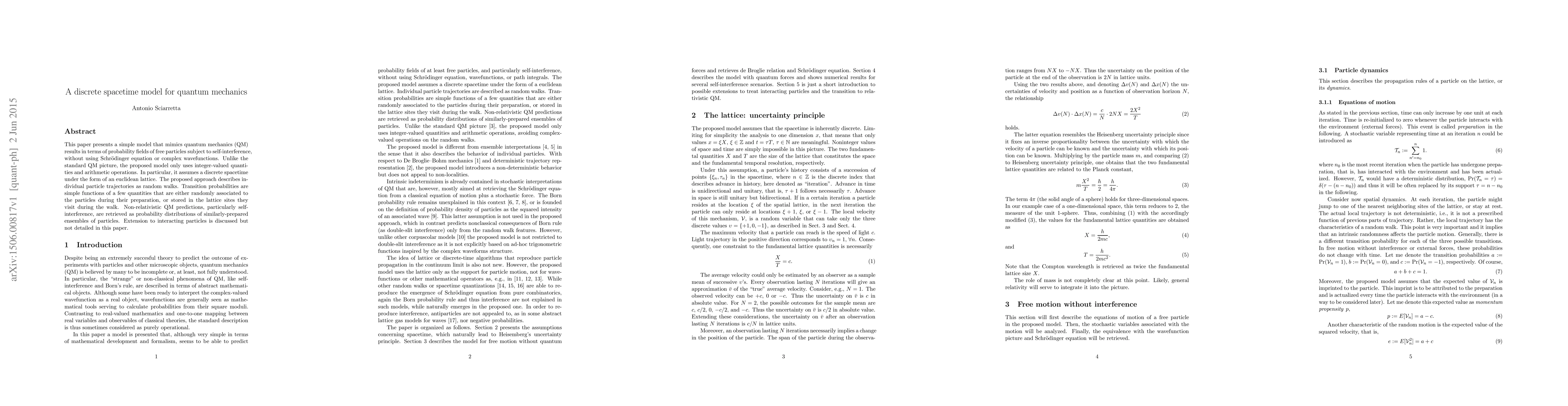 This paper presents a simple model that mimics quantum mechanics (QM) results in terms of probability fields of free particles subject to self-interference, without using Schroedinger equation or complex wavefunctions. Unlike the standard QM picture, the proposed model only uses integer-valued quantities and arithmetic operations. In particular, it assumes a discrete spacetime under the form of an euclidean lattice. The proposed approach describes individual particle trajectories as random walks. Transition probabilities are simple functions of a few quantities that are either randomly associated to the particles during their preparation, or stored in the lattice sites they visit during the walk. Non-relativistic QM predictions, particularly selfinterference, are retrieved as probability distributions of similarly-prepared ensembles of particles. Extension to interacting particles is discussed but not detailed in this paper.