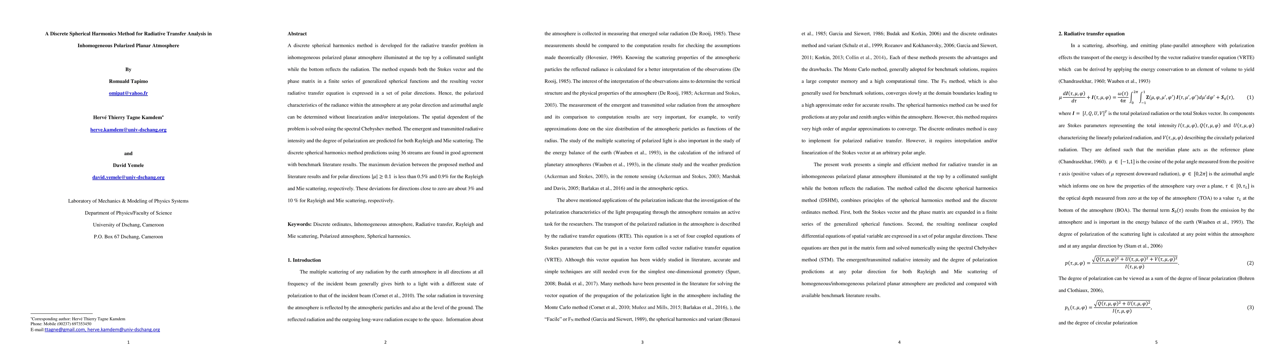 This paper develops a discrete spherical harmonics method for analyzing radiative transfer in inhomogeneous polarized planar atmospheres, achieving accurate predictions of emergent and transmitted intensity and polarization without linearization. The method shows good agreement with benchmark results, with deviations less than 1% for significant polar directions.