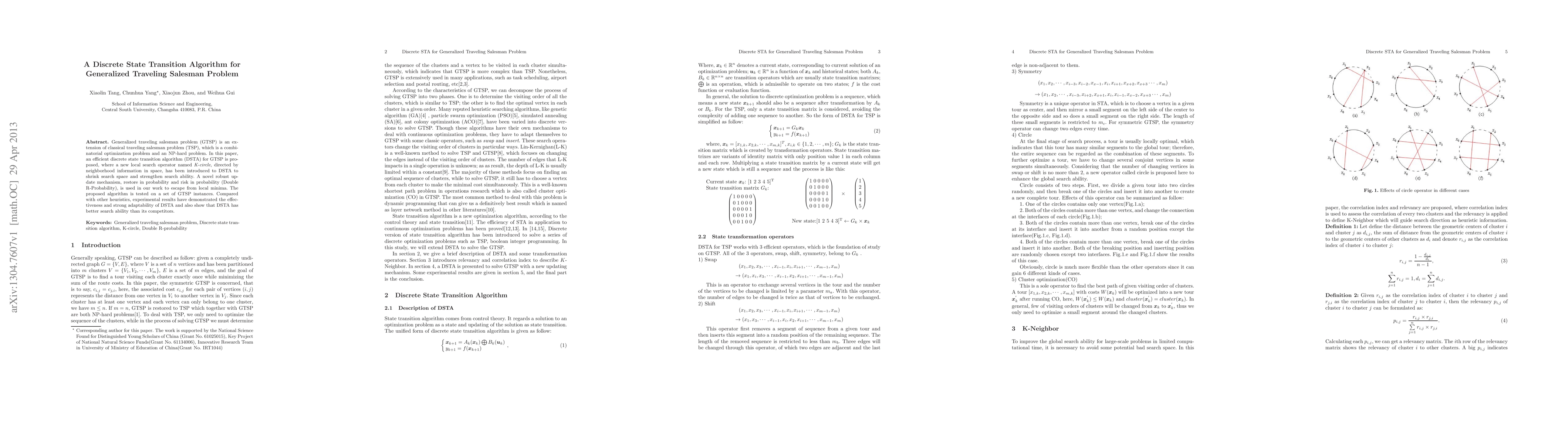 This paper proposes a discrete state transition algorithm (DSTA) for the generalized traveling salesman problem (GTSP), introducing a K-circle local search operator and a Double R-Probability update mechanism to enhance search efficiency and escape local minima. Experimental results show that DSTA outperforms other heuristics in terms of adaptability and search capability.