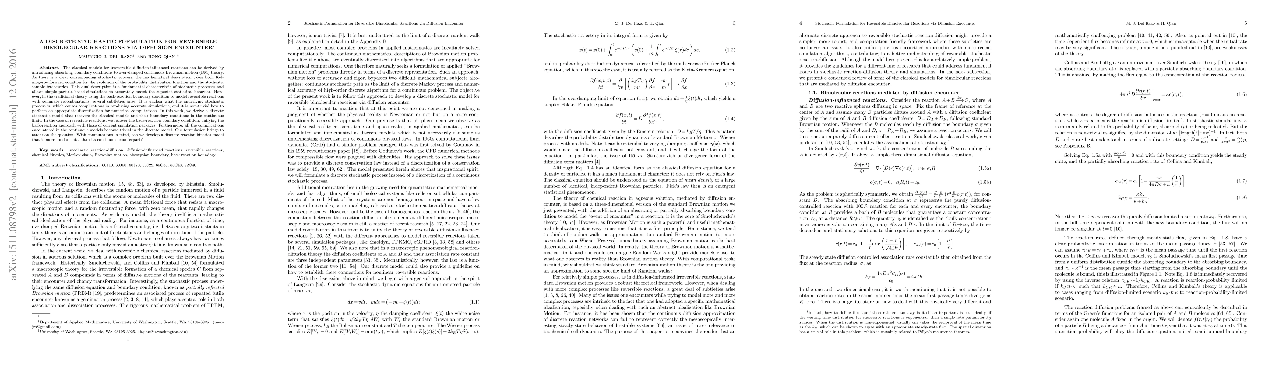 This paper develops a discrete stochastic formulation for reversible bimolecular reactions via diffusion encounter, addressing the complexities of traditional continuous models. The proposed discrete model simplifies simulations and resolves issues in the continuous framework, prompting a discussion on the potential superiority of discrete models for reaction kinetics.