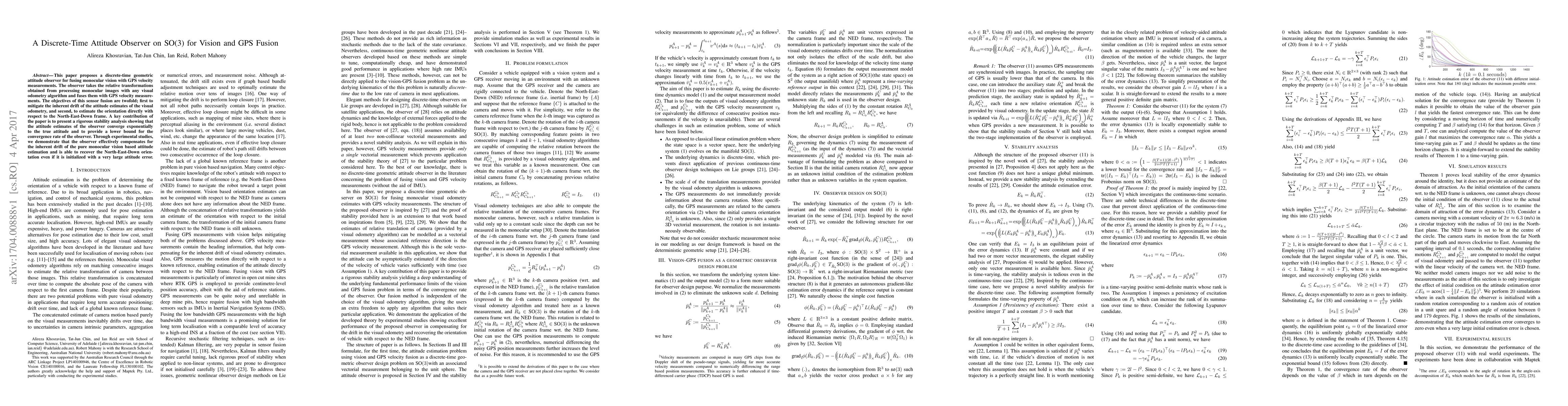 This paper proposes a discrete-time attitude observer for fusing monocular vision and GPS data to mitigate drift in visual odometry and estimate orientation in the North-East-Down frame. The observer's stability is rigorously analyzed, showing exponential convergence to true attitude and providing a convergence rate lower bound.
