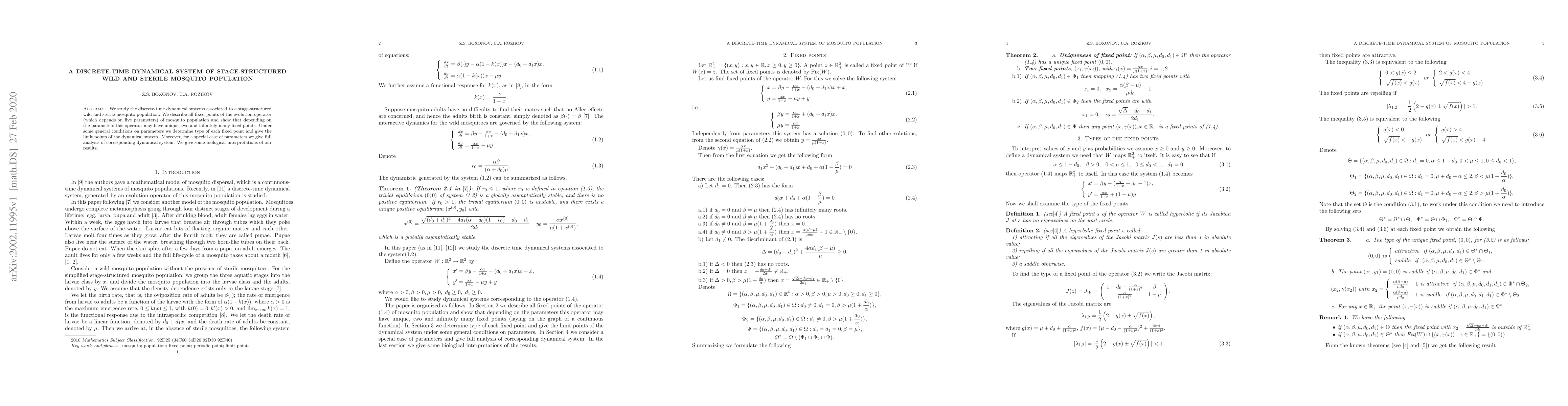 Researchers studied a model of mosquito population dynamics, finding that the system can have unique, two, or infinitely many fixed points depending on parameters, with some cases having stable populations and others leading to extinction.