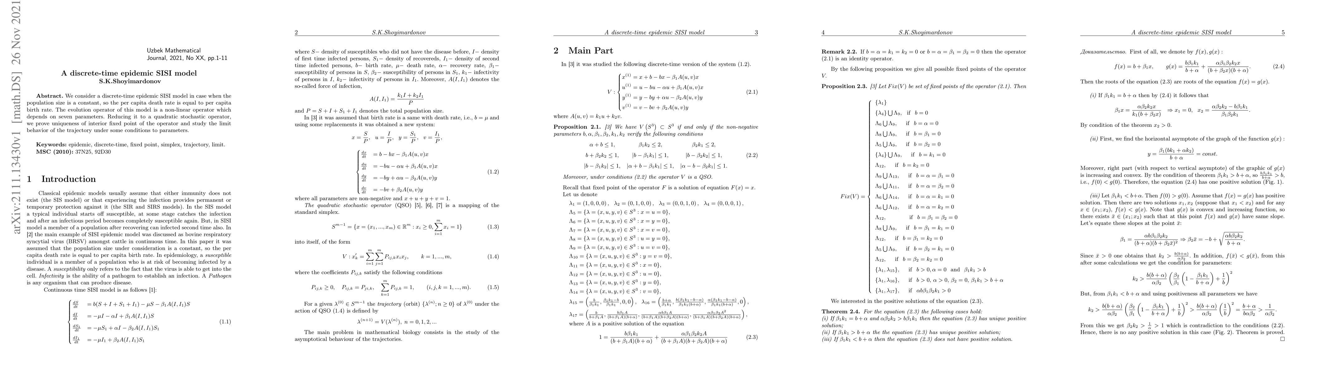 We consider a discrete-time epidemic SISI model in case when the population size is a constant, so the per capita death rate is equal to per capita birth rate. The evolution operator of this model is a non-linear operator which depends on seven parameters. Reducing it to a quadratic stochastic operator, we prove uniqueness of interior fixed point of the operator and study the limit behavior of the trajectory under some conditions to parameters.