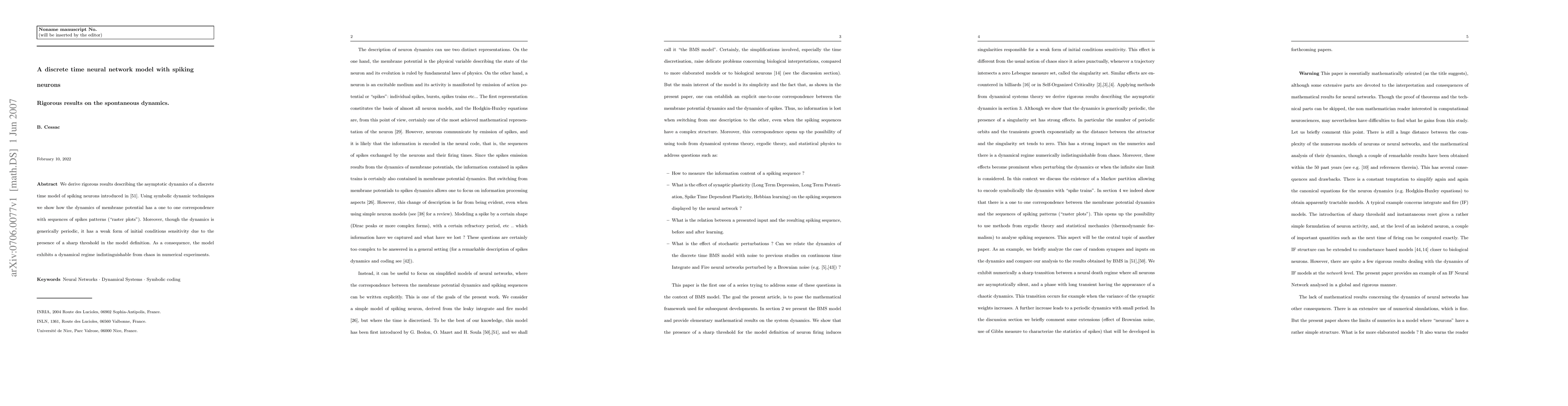 We derive rigorous results describing the asymptotic dynamics of a discrete time model of spiking neurons introduced in \cite{BMS}. Using symbolic dynamic techniques we show how the dynamics of membrane potential has a one to one correspondence with sequences of spikes patterns (``raster plots''). Moreover, though the dynamics is generically periodic, it has a weak form of initial conditions sensitivity due to the presence of a sharp threshold in the model definition. As a consequence, the model exhibits a dynamical regime indistinguishable from chaos in numerical experiments.