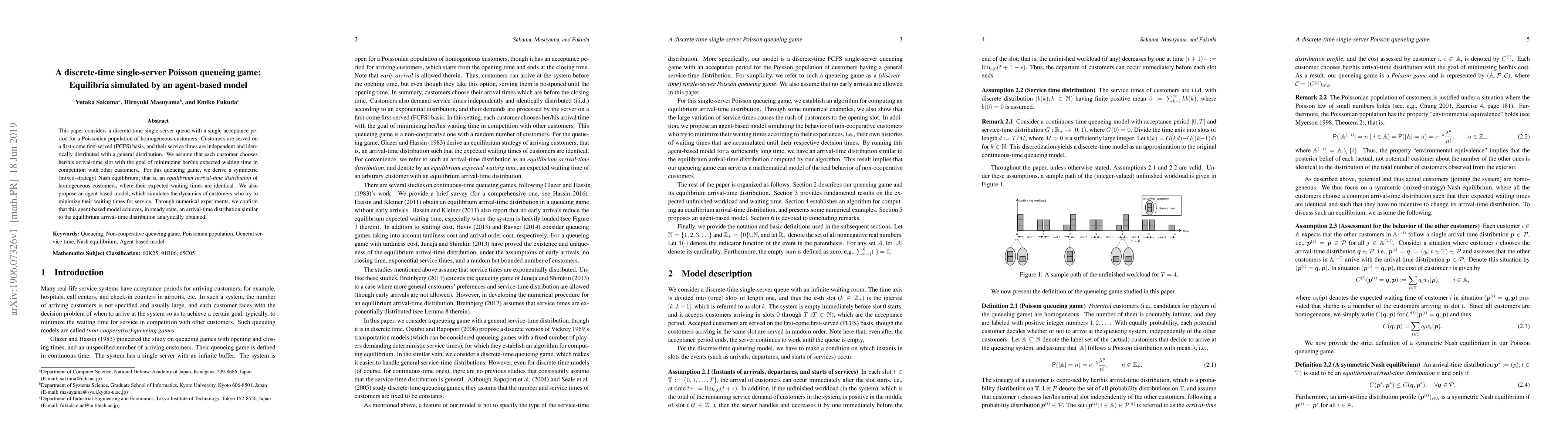 This paper studies a discrete-time single-server queue where customers aim to minimize their waiting times by choosing optimal arrival times. It derives a symmetric Nash equilibrium for the arrival-time distribution and validates this through an agent-based model simulation, confirming the equilibrium's accuracy.