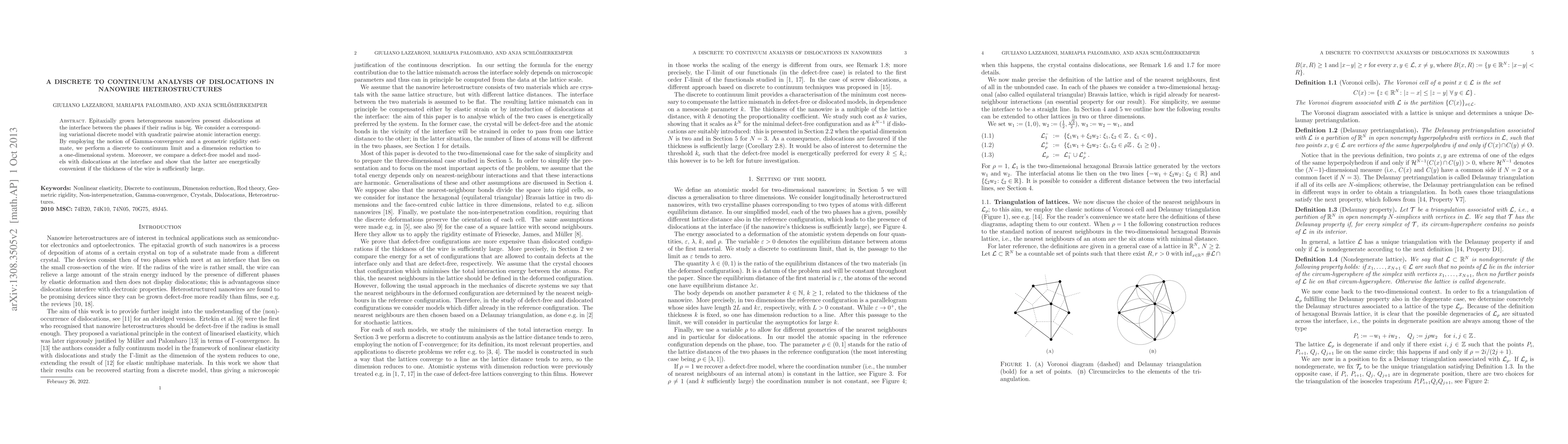 Epitaxially grown heterogeneous nanowires present dislocations at the interface between the phases if their radius is big. We consider a corresponding variational discrete model with quadratic pairwise atomic interaction energy. By employing the notion of Gamma-convergence and a geometric rigidity estimate, we perform a discrete to continuum limit and a dimension reduction to a one-dimensional system. Moreover, we compare a defect-free model and models with dislocations at the interface and show that the latter are energetically convenient if the thickness of the wire is sufficiently large.