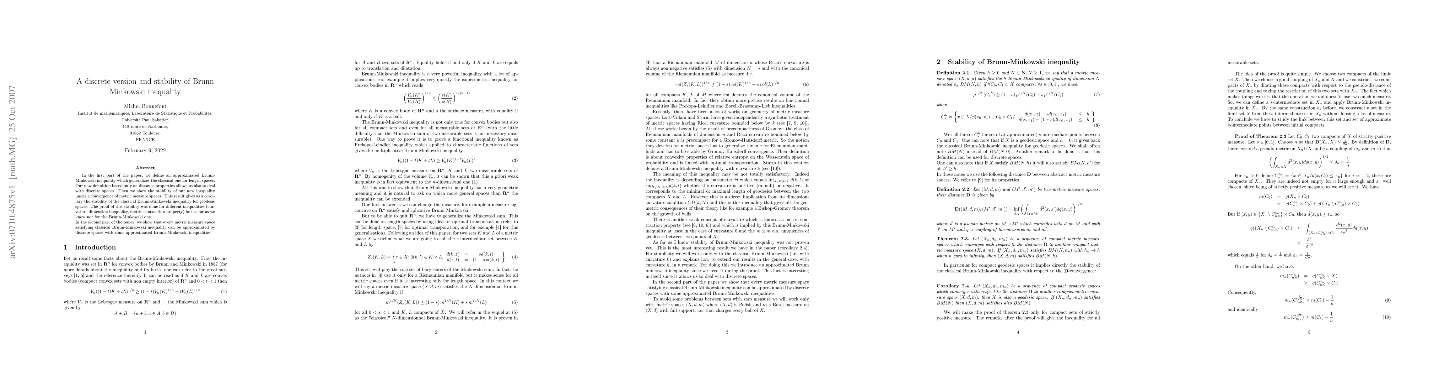 This paper introduces a discrete version of the Brunn-Minkowski inequality applicable to length spaces and proves its stability under convergence of metric measure spaces, extending the classical Brunn-Minkowski inequality's stability to geodesic spaces. It also demonstrates that classical Brunn-Minkowski-satisfying spaces can be approximated by discrete spaces.