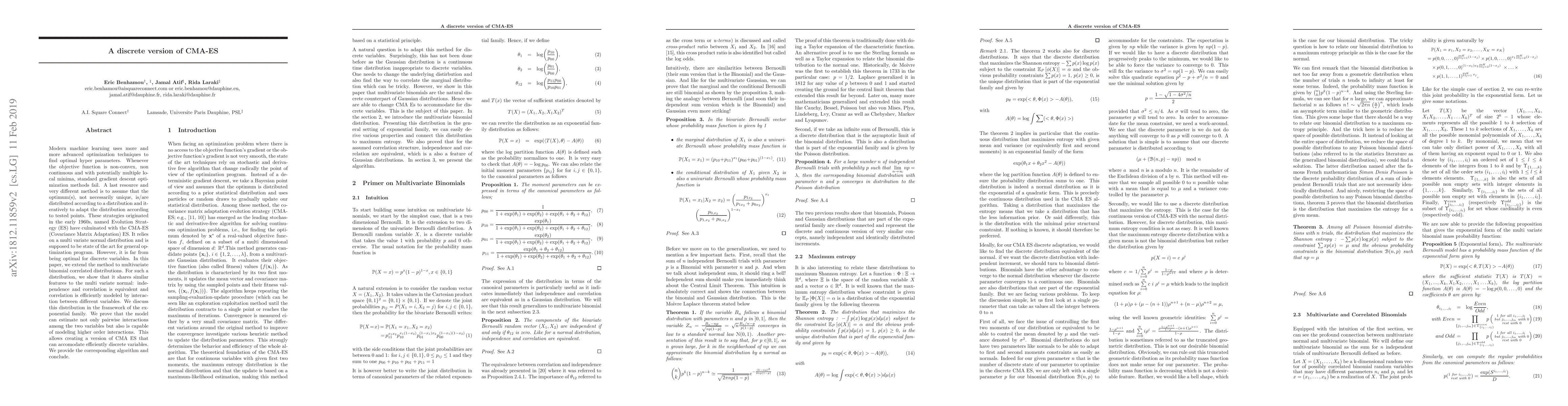 Modern machine learning uses more and more advanced optimization techniques to find optimal hyper parameters. Whenever the objective function is non-convex, non continuous and with potentially multiple local minima, standard gradient descent optimization methods fail. A last resource and very different method is to assume that the optimum(s), not necessarily unique, is/are distributed according to a distribution and iteratively to adapt the distribution according to tested points. These strategies originated in the early 1960s, named Evolution Strategy (ES) have culminated with the CMA-ES (Covariance Matrix Adaptation) ES. It relies on a multi variate normal distribution and is supposed to be state of the art for general optimization program. However, it is far from being optimal for discrete variables. In this paper, we extend the method to multivariate binomial correlated distributions. For such a distribution, we show that it shares similar features to the multi variate normal: independence and correlation is equivalent and correlation is efficiently modeled by interaction between different variables. We discuss this distribution in the framework of the exponential family. We prove that the model can estimate not only pairwise interactions among the two variables but also is capable of modeling higher order interactions. This allows creating a version of CMA ES that can accommodate efficiently discrete variables. We provide the corresponding algorithm and conclude.