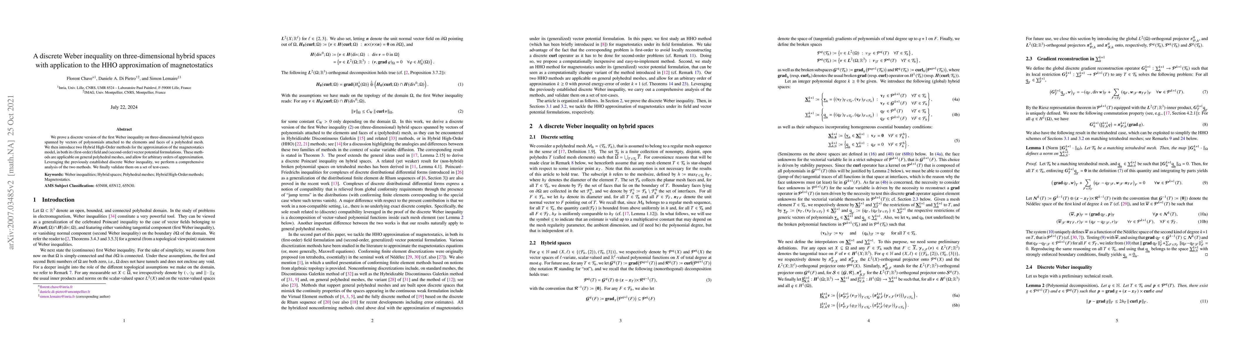 We prove a discrete version of the first Weber inequality on three-dimensional hybrid spaces spanned by vectors of polynomials attached to the elements and faces of a polyhedral mesh. We then introduce two Hybrid High-Order methods for the approximation of the magnetostatics model, in both its (first-order) field and (second-order) vector potential formulations. These methods are applicable on general polyhedral meshes, and allow for arbitrary orders of approximation. Leveraging the previously established discrete Weber inequality, we perform a comprehensive analysis of the two methods. We finally validate them on a set of test-cases.
