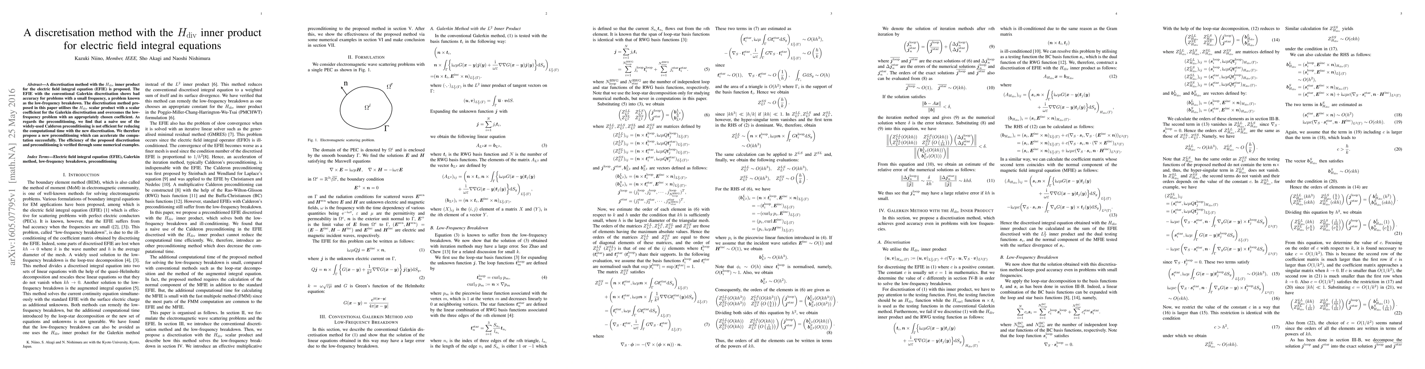 A discretisation method with the $H_{\rm div}$ inner product for the electric field integral equation~(EFIE) is proposed. The EFIE with the conventional Galerkin discretisation shows bad accuracy for problems with a small frequency, a problem known as the low-frequency breakdown. The discretisation method proposed in this paper utilises the $H_{\rm div}$ scalar product with a scalar coefficient for the Galerkin discretisation and overcomes the low-frequency problem with an appropriately chosen coefficient. As regards the preconditioning, we find that a naive use of the widely-used Calderon preconditioning is not efficient for reducing the computational time with the new discretisation. We therefore propose a new preconditioning which can accelerate the computation successfully. The efficiency of the proposed discretisation and preconditioning is verified through some numerical examples.