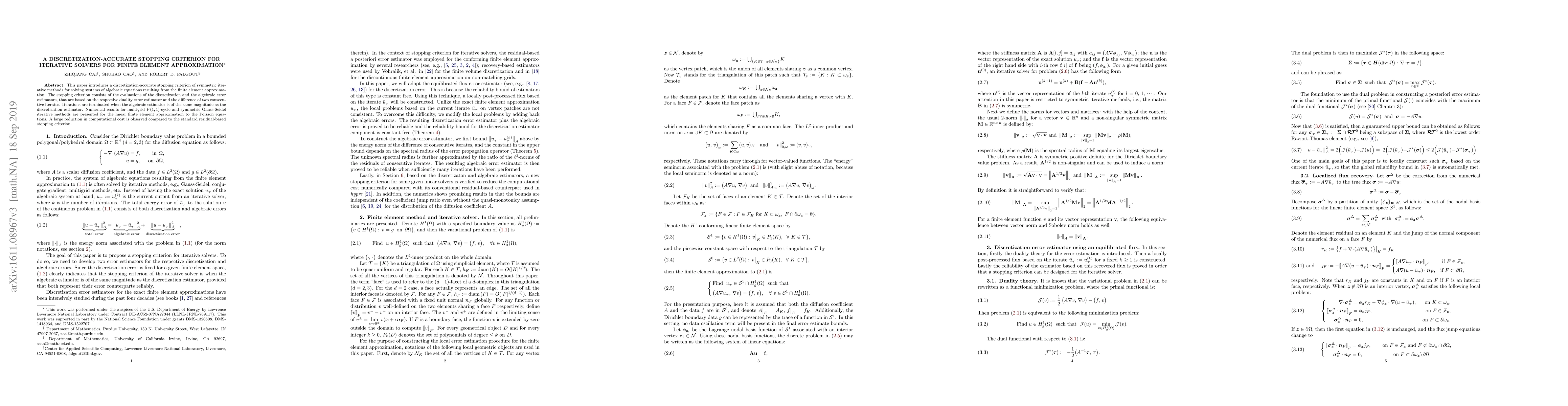 This paper proposes a discretization-accurate stopping criterion for iterative solvers in finite element methods, utilizing duality and iterate difference estimates. Numerical results show significant computational cost reductions for multigrid and Gauss-Seidel methods in solving Poisson equations compared to traditional residual-based criteria.